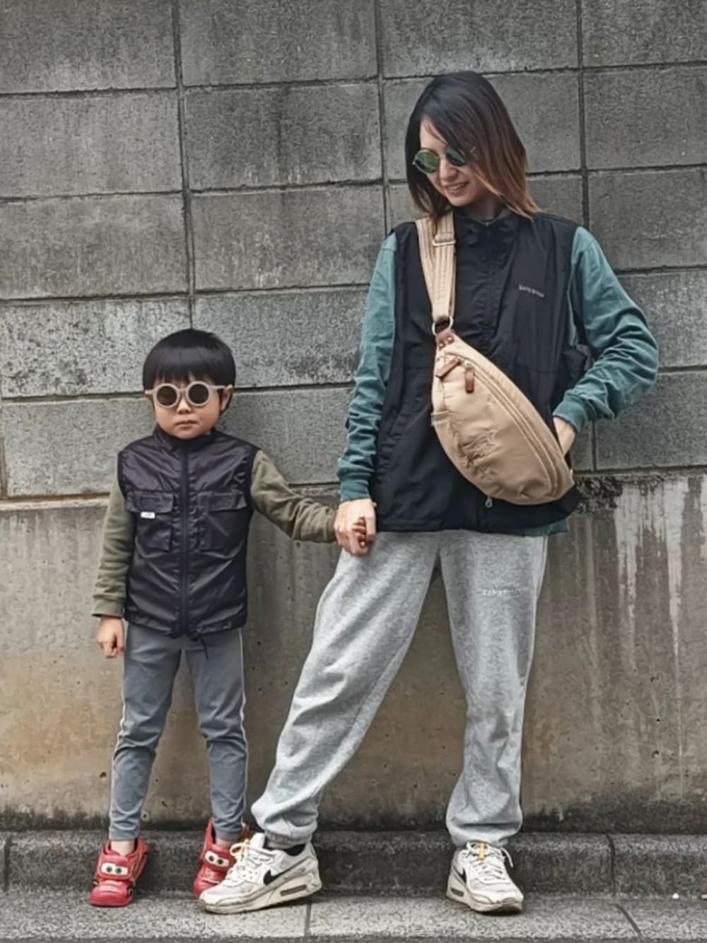 息子とお揃いっぽくナイロンジャケットでキメてみました! 息子の服はほぼ古着屋で掘り出し物を探しています。カーズのマックイーンのサンダルは息子のお気に入り🏎️