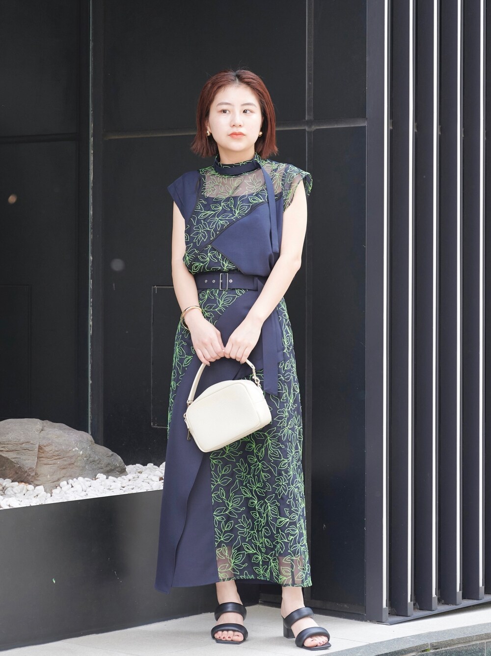 刺繍が印象的かつ、オーガンジーが夏らしさもあるセットアップスタイル。ネイビーとグリーンの組み合わせがおしゃれに決まります。お呼ばれコーデにも普段使いでもさまざまなシーンで活躍するアイテムです◎