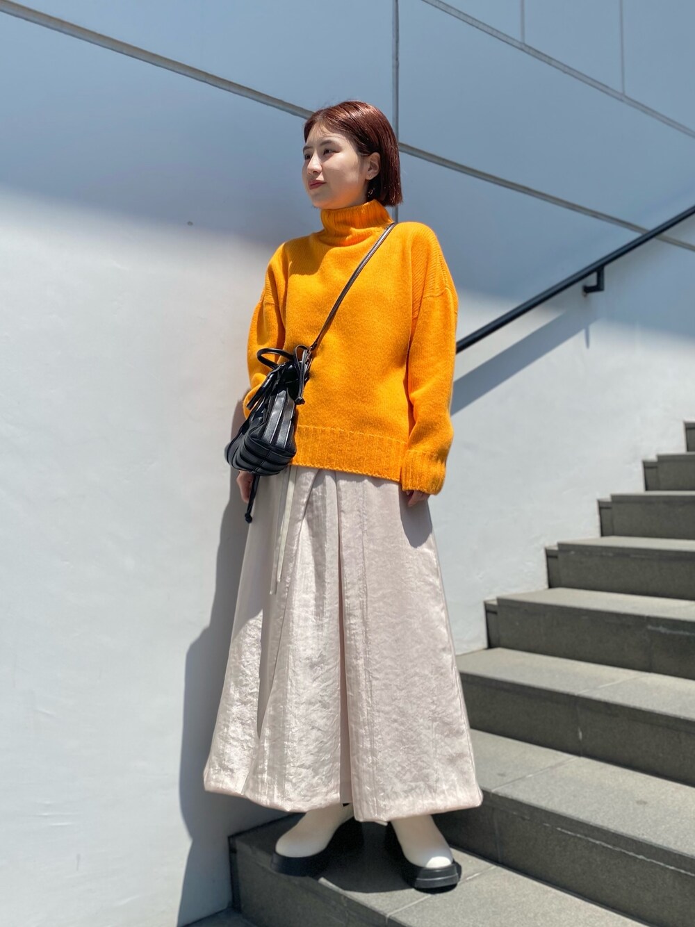 オレンジのニットにフレアスカートを合わせて、明るいゆるっとコーデに。 スカートは光沢感もあり、キレイめな印象になり、コーデが締まります◎ ニットには、スリットが入っているので、アウトスタイルでも着やすいです。