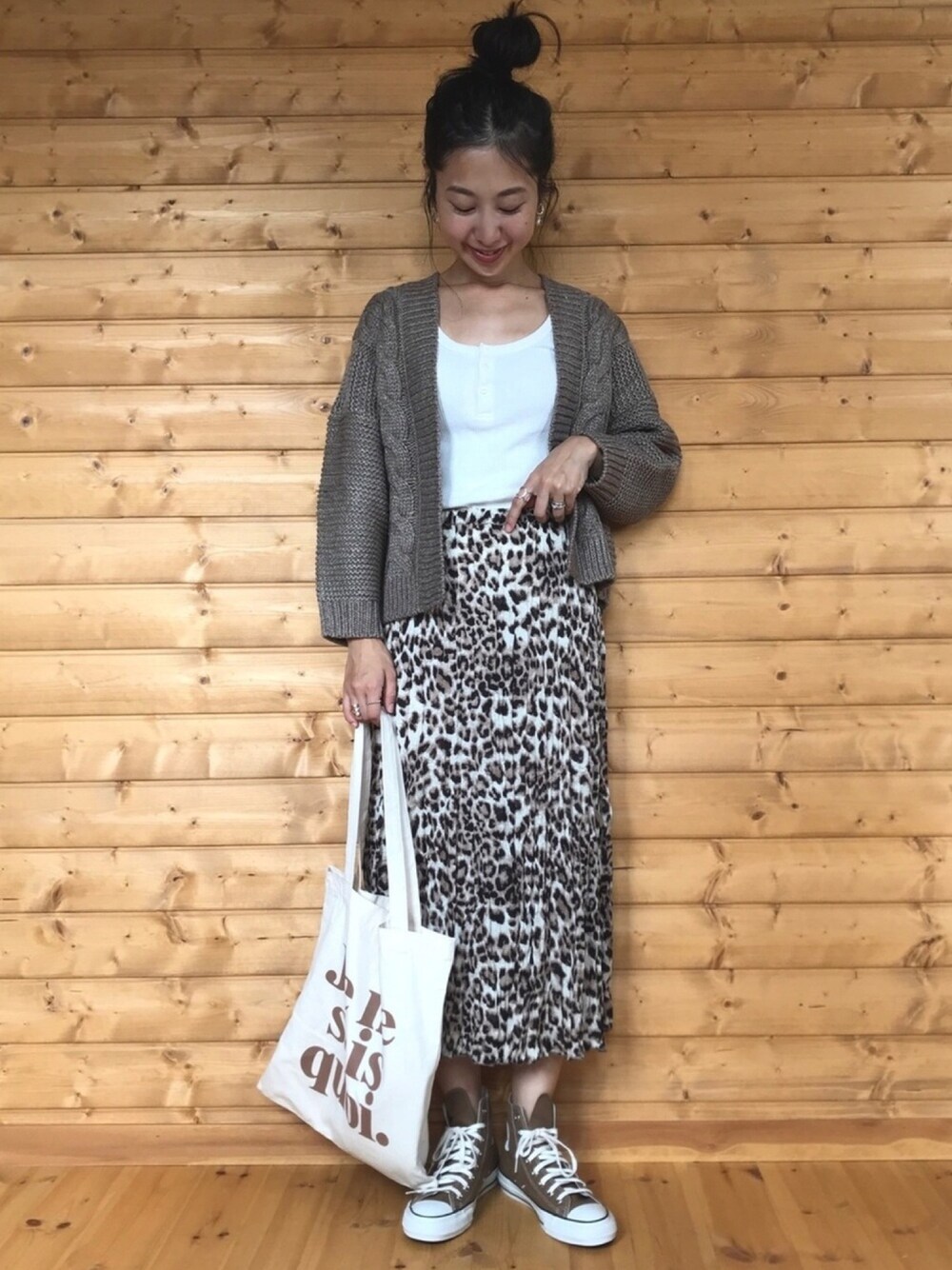 Sonny Labelの 《ケーブルガウンニット》 秋冬のケーブルは可愛い☺️❤️ そして着丈がとてもいい感じなのです! ガウンタイプで前開きなので、ベルトとかでしめても可愛いと思います☺︎ socollaの 《【socolla】カットワンピース×柄ギャザースカートセット》 のスカート! しっかりレオパード🐆‼️っていうこれひとつでポイントになるアイテムです✨ セットのワンピースと組み合わせればレオパードの面積狭くなるので、レオパードに抵抗ある方でも着られるかなぁと思います☺︎ ブラウン系でまとめました! Instagram→@___karikarikari___