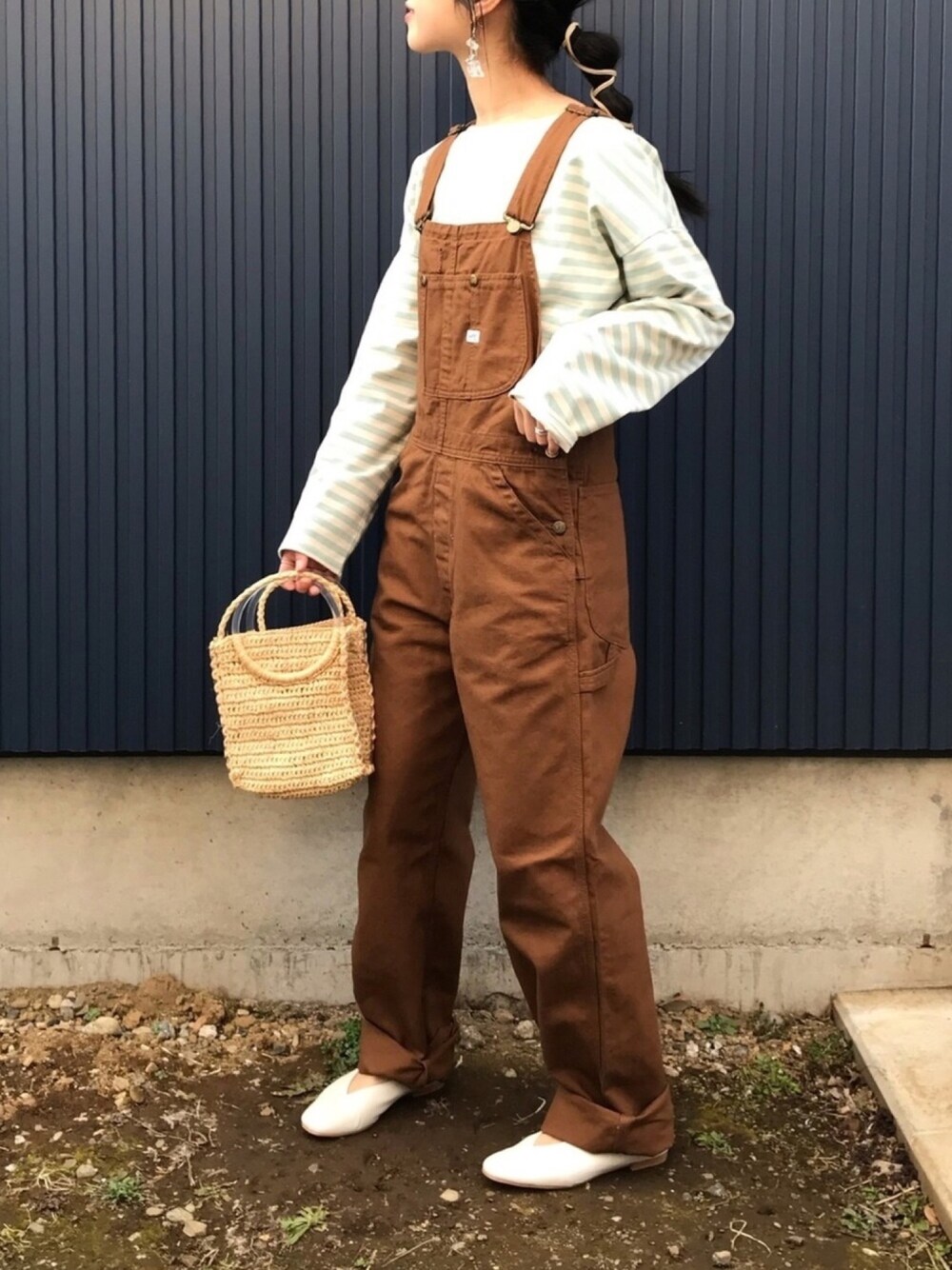 KBFの 《BIGBIGボーダーTシャツ》 ゆるっとしたオーバーオールに合わせるのもダボっとしてかわいい☺️❤️ 短すぎるトップスだとサイドから見えちゃうんじゃないかと心配になるので😀こういう長めのトップスはもってこい! 色味もブラウンに合わせたらいい感じ〜✨ Leeの 《オーバーオール color》 着やすくてかわいくてたくさん着てる! シルエットがホント理想的! カゴバッグ持ったら牧場感出てきたので、足元はVカットパンプスにしてみました〜 Instagram→@___karikarikari___