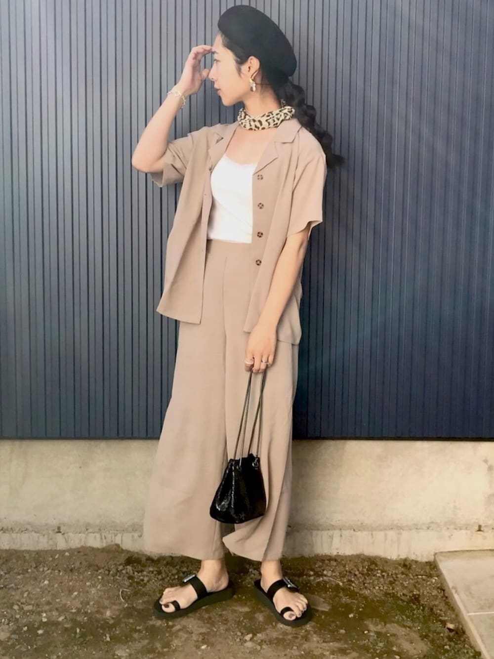 セットアップ! 小物使いにこだわる☺︎ GeeRAの 《【20夏新着】カイキンシャツ&ワイドパンツセットアップ》 カイキンシャツを前開きで着てみたら雰囲気変わって良かった! とにかく、テロンとした素材が心地よくてどちらのシルエットも良くて、別々でも使えて、かなり着回しのきくセットアップです! 小物次第でキレイめにもなるし、カジュアルにもなるし、こういうちょっとキレイ目アイテムは本当に使えるのでおすすめ☺︎ パンツもウエストゴムなので履きやすいです🙆♀️ EVOLの 《【EVOL】バックルサンダル IO9089》 シンプルコーデにバックルがかなりポイントになってくれます! 合わせやすいし、履くだけで雰囲気出るし、履き心地も良いし、大活躍!! KU-CROISSANTの 《ステンレス マルチサークル ピアス》 耳元に程よい主張👂✨ しゃらしゃらっと揺れる感じも可愛いんです🥰 anq.の 《【anq.】シルバー 925 Tバーアクセント チェーンブレスレット》 程よい太さのチェーンがかなり合わせやすい! 肌馴染みもよく、着けていてもそんなに気にならないから普段使いにもオススメ! ベレー帽、バッグ、サンダルの黒をポイントに! スカーフの色を統一させて Instagram→@___karikarikari___