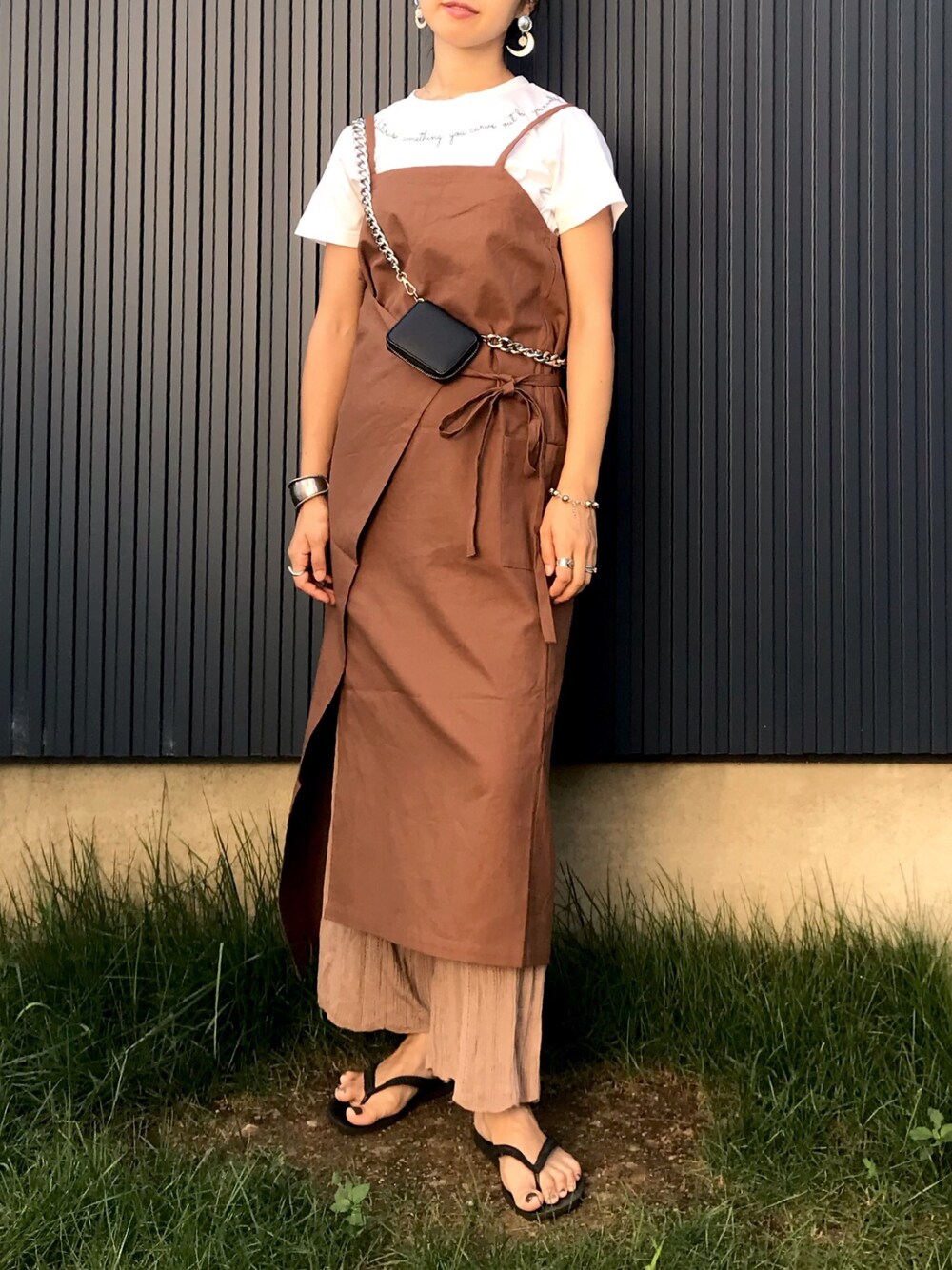 ブラウンにブラックとシルバーでキリリ✨ HERENCIA 《ネックラインメッセージロゴTEE》 フロント部分だけじゃなくて後ろまでぐるりと入ったメッセージロゴがとってもオシャレ♡ ネックレスとかスカーフとかせずにオシャレな首もとになれちゃう! キャミワンピと合わせてロゴを際立たせてみました☺︎ 筆記体ロゴで大人かわいく着られるTシャツです☺︎ 本日ZOZOTOWNにて ¥2,000クーポンでてます! 素敵アイテムたくさんなので、この機会にぜひ〜♡ VACANCYのキャミワンピ 《【VACANCY】コットンツイルラップキャミワンピース》 これかわいいなーと見ていたらとてもお得に✨ ラップデザインのキャミワンピ、すんごいかわいいし、丈も長すぎず着回し効きます! Auntie Rosa Holiday 《【Holiday】クロシェ透かし編みニットパンツ》 柔らかくてはき心地いいし、かわいいし、ついつい手に取っちゃう☺︎ 透かし編みニットでレイヤードスタイルにも重宝してます🧡 Instagram→@___karikarikari___