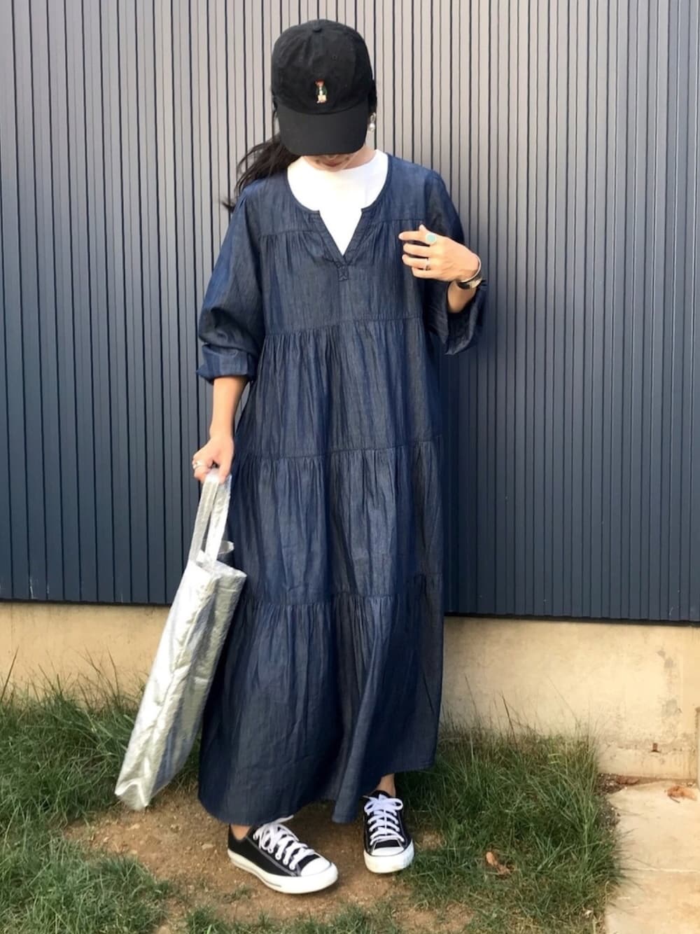 カジュアル Sonny Label 《デニムティアードロングワンピース》 柔らかくて着心地よいワンピース☺︎ ティアードデザインでゆったりしてるのでリラックス感ありあり🥰 首元が広めに開いているので、中にTシャツ仕込んでもカジュアルさ増し増しでいい感じ🙆♀️ 今の季節から秋🍂冬⛄️春🍀と活躍するワンピース✨ ap retro 《アソートバックプリントTEE【ZOZO限定アイテム】》 ゆるっと着られるのが嬉しいTシャツ☺︎ 白Tって一枚で着てもよし!レイヤードしてもよし!なのでかなり汎用性高いです😎✨ 本日クーポンday✨ 黒小物とインディゴでかなり深めの色合いになったところのシルバーバッグがポイント! くまさんキャップの遊び心もポイント! Instagram→@___karikarikari___