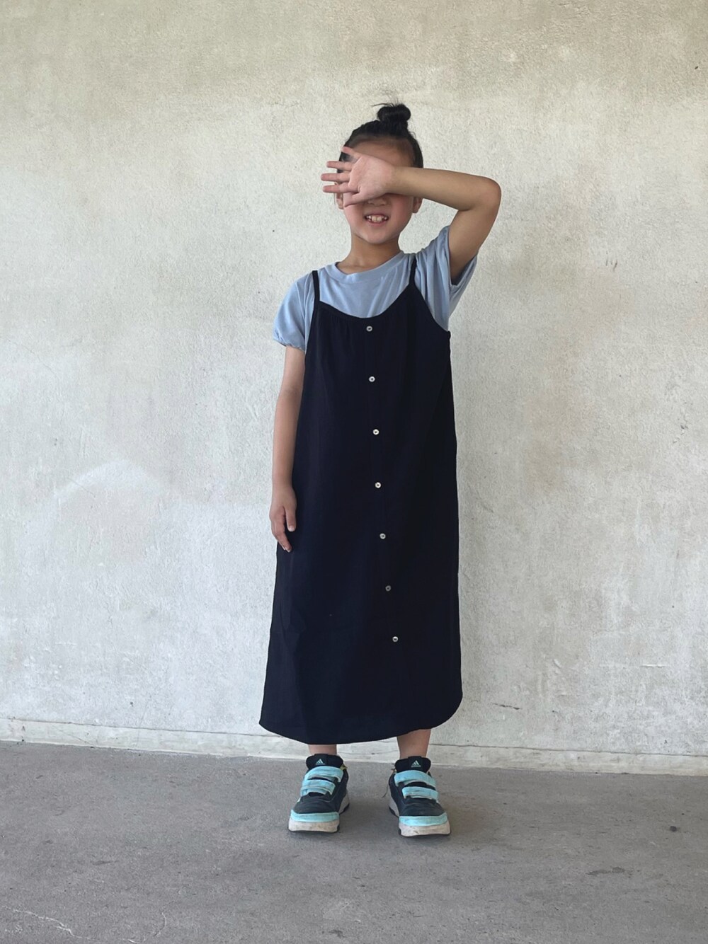 yukariのワンピース「キャミ×ジャンパースカートドッキングワンピース(120~160cm)」を使ったコーディネート