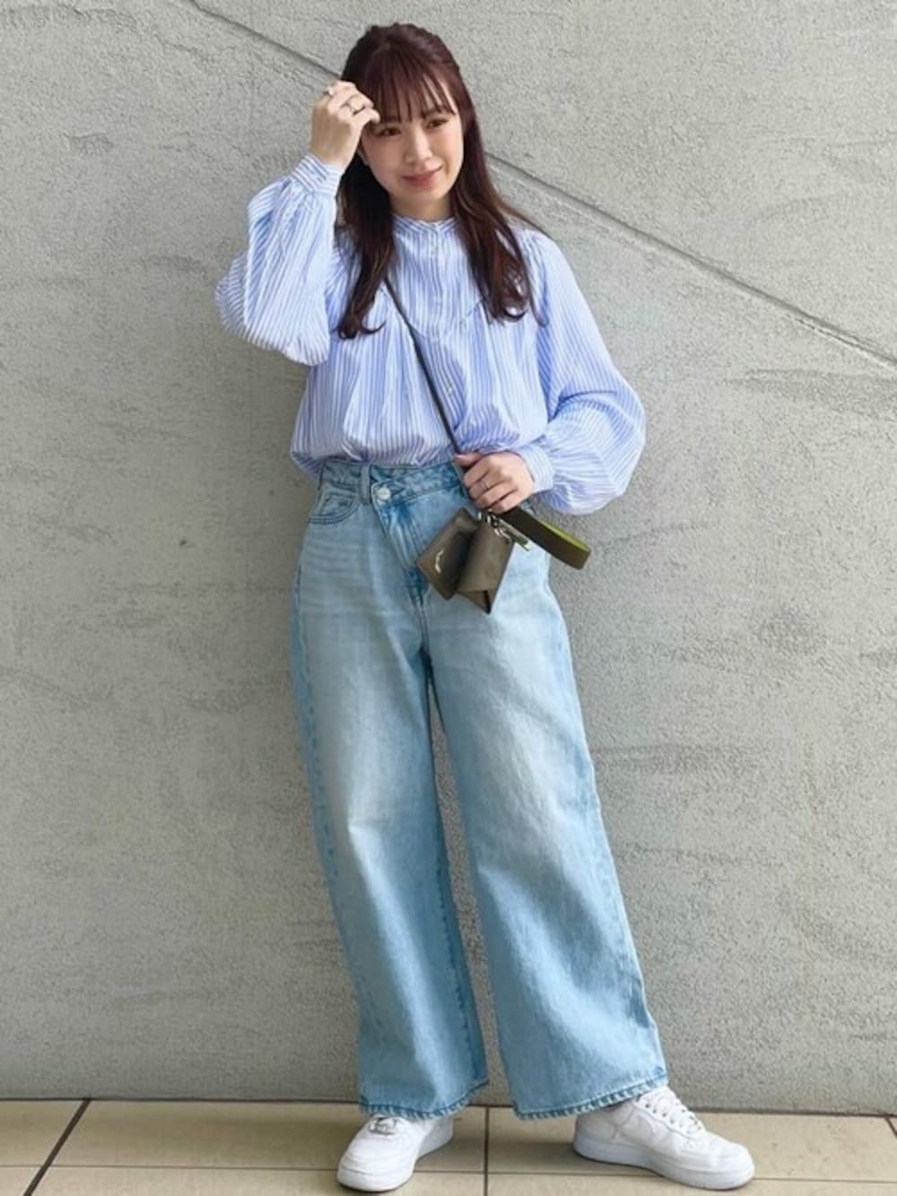*160センチ *骨格ウェーブ Instagram→yukaah21 【デニム】着用感 ・トレンドのウエストボタンがアシンメトリーになっていて、内側のボタンでもウエスト調節できます!