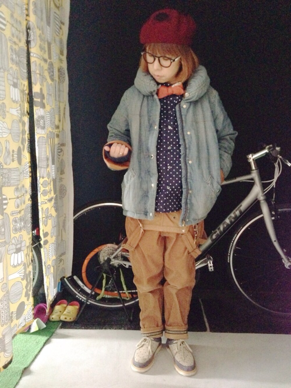 今日は寒過ぎて、今年初のデニワタ投入! 蝶ネクタイはポロシャツに付いていたのを拝借★ ベレー帽は激安のに、自分でドットペイントしました☻