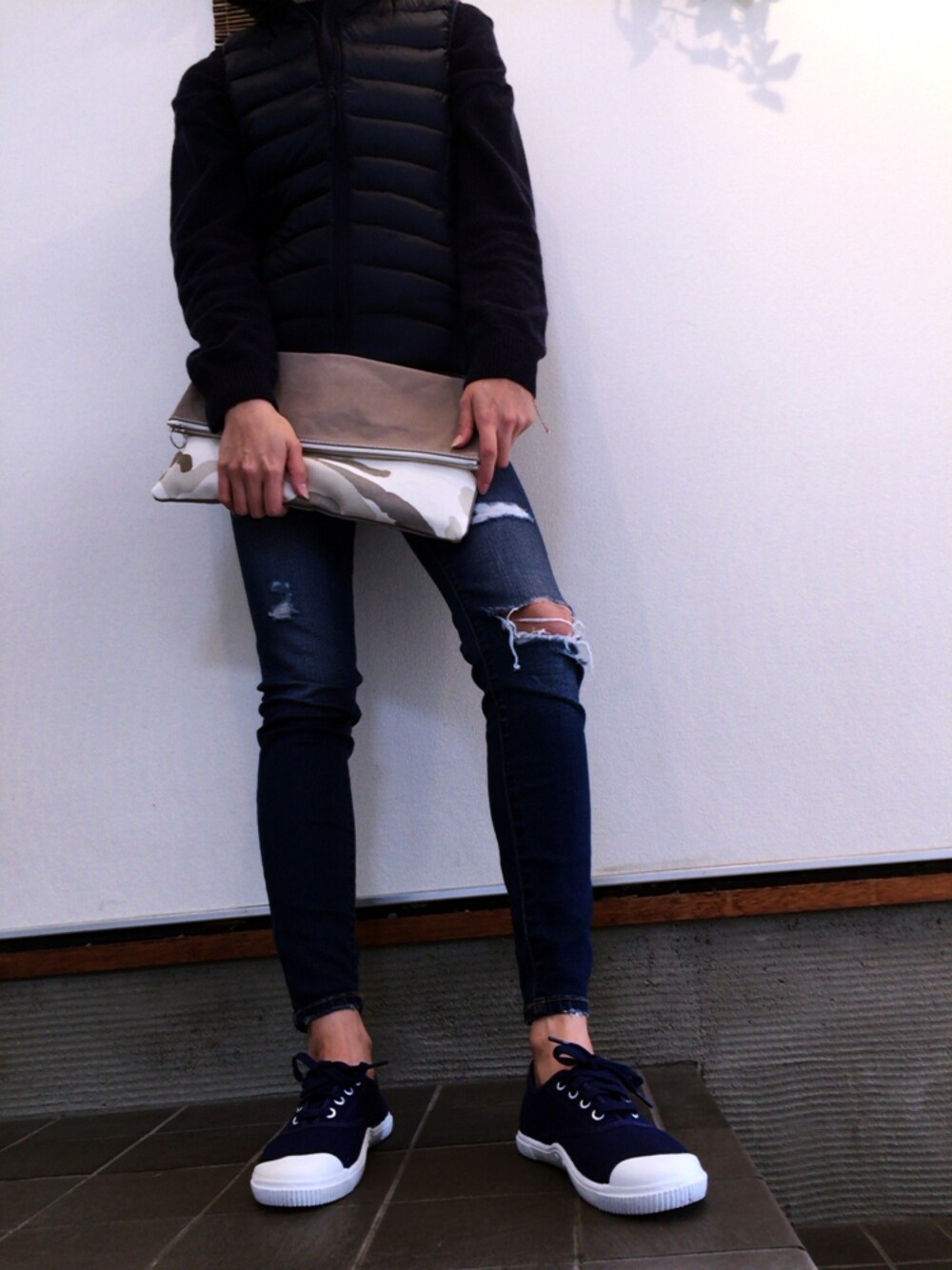 キーンのスニーカー セールで¥2600で!!🤗 履きやすさ◎ ワントーンコーデで! 素材違いでカバンに インパクトでカモフラ柄💚 UNIQLOダウンベスト 色違いで買ってこよかな〜(笑)