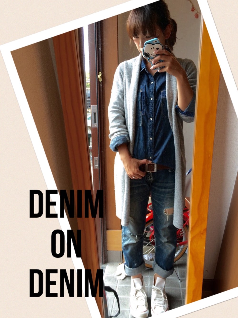 雑誌かなにかで見てしたかった デニムおんデニムにグレーカーデ٩( ᐛ )و ヒールにしようか迷ったけど、 カジュアルな気分だったから またまたスニーカー👟