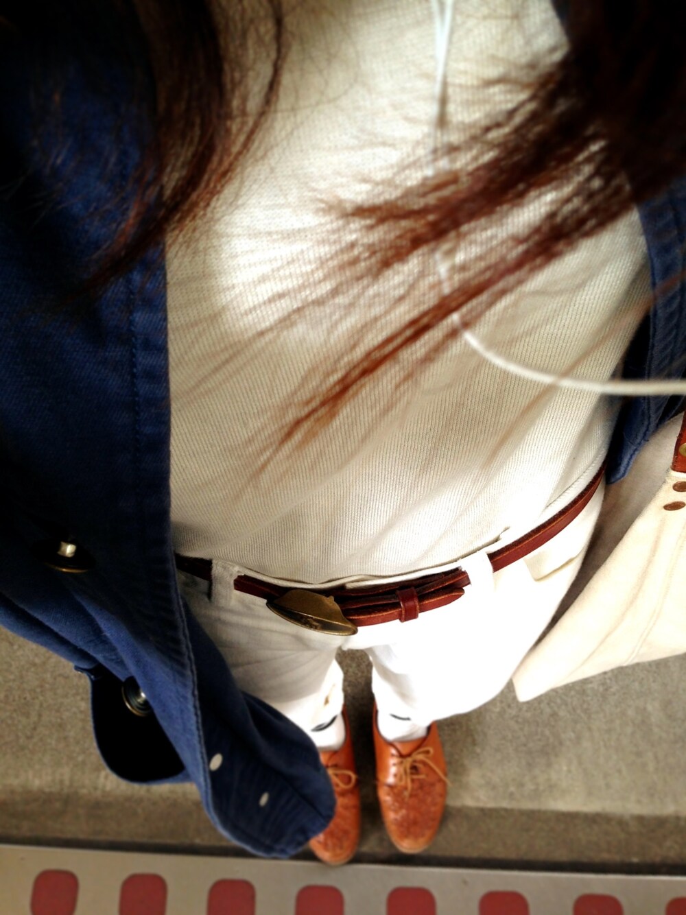 トップス/無印良品 ボトム/無印良品 ワークコート/used 靴/used 今日、白・青・茶 、の日 髪の毛、じゃまくさいのね