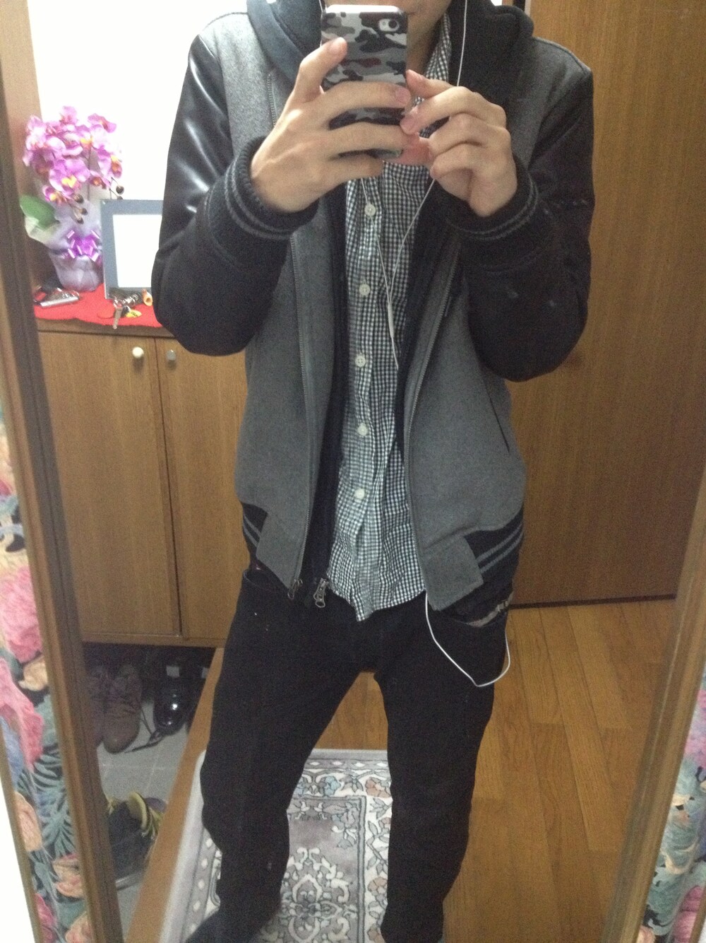 スタジャン:チャオパニック パーカー:ユニクロ ギンガムチェックシャツ:ハレ ジーンズ:ディーゼル 今日はモノトーン気分♪ スニーカーも黒にしてロールUPしました!靴履かずに写真撮ってしまいましたが…笑 ギンガムチェックシャツではずしました。