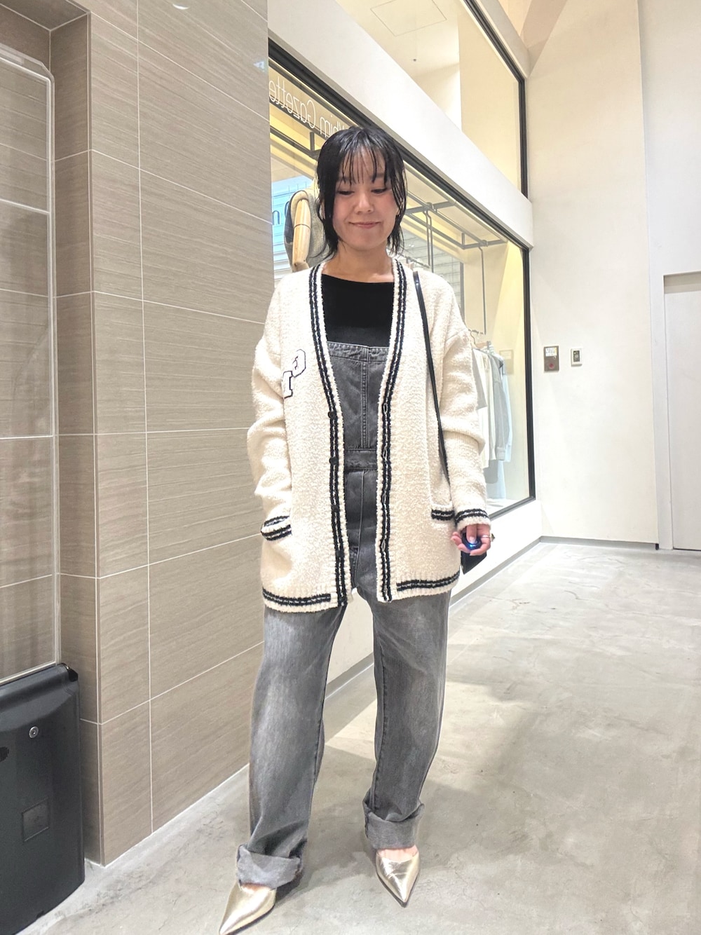【インナー】 着用サイズフリー/普段サイズ7〜9号 背中の開きが綺麗なカットソー。ほんのり透け感があり、女性らしく着られとても上品見えします。 【オールインワン】 着用サイズフリー/普段サイズ7〜9号 大人気のオールインワンにブラックが登場。ブルーにはないシックな雰囲気を楽しんでいただけますよ。肩紐が細いので子どもっぽくならないのがオススメポイント。 【カーディガン】 着用サイズフリー/普段サイズ7〜9号 ゆったりサイズの使いやすいカーディガン。胸元のロゴがポイントです。軽くて柔らかな肌触りでチクチクが苦手な方にも安心して着られる顔アイテムです。