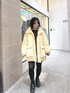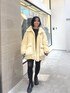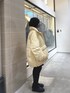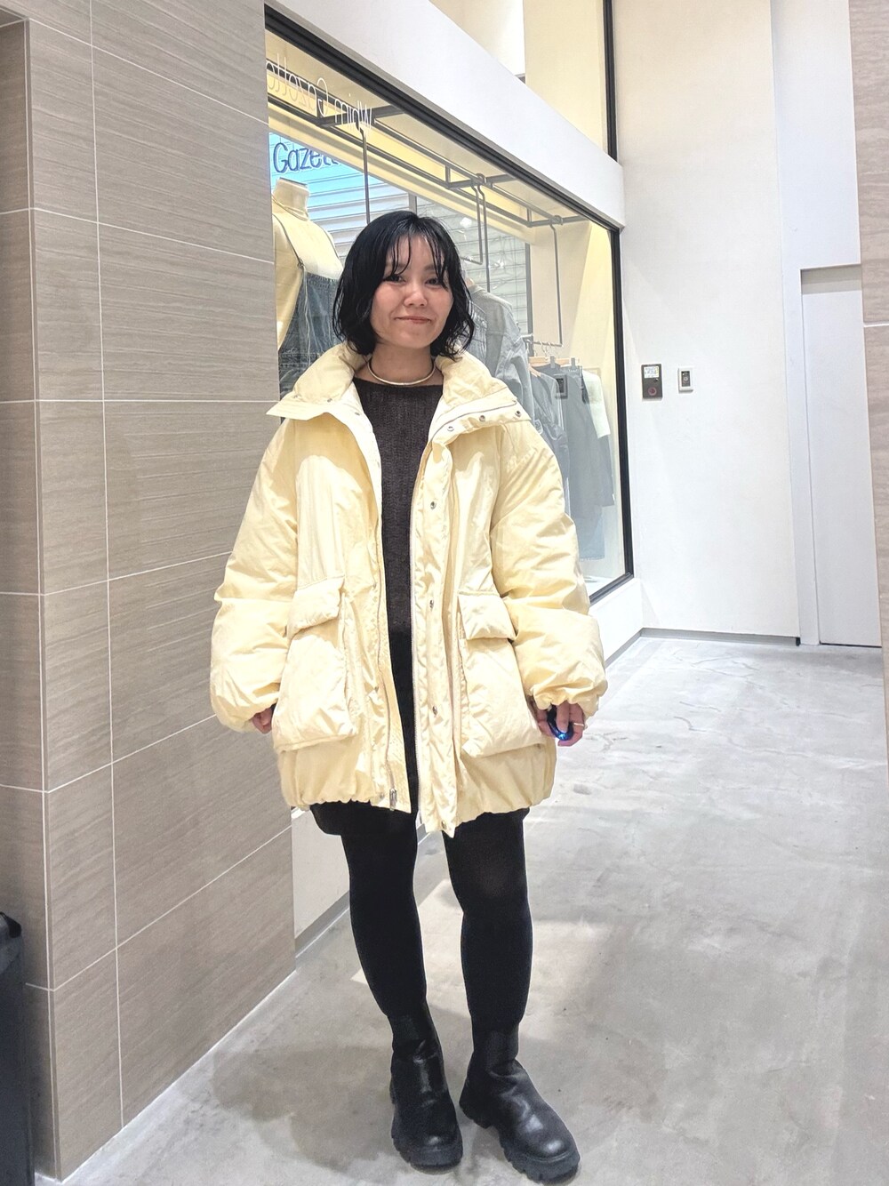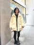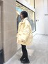 【ダウン】 着用サイズフリー/普段サイズ7〜9号 ゆったりシルエットのダウンコート。キルティングがないので、普通のコートのように使えるアイテムです。オーバーサイズですがとても軽く、スタンドカラーのデザインで首元まであったかです。 裾がゴムでバルーンのデザインになっており、小柄さんもバランス良く着られるアイテムです。 【パンツ】 着用サイズフリー/普段サイズ7〜9号 ゆったりしたサイズ感のショートパンツ。腰骨でとまる感じで着用しています。シンプルなデザインなのでいろんなスタイリングを楽しめます。