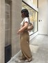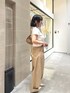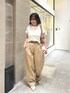 【Tシャツ】 着用サイズフリー/普段サイズ7〜9号 コンパクトサイズのTシャツ。コンパクトですが、素材がしっかりしているので身体のシルエットを拾いすぎずとても綺麗です。 【パンツ】 着用サイズ34/普段サイズ7〜9号 ゆったりしたダボっとしたシルエットが可愛いチノパン。大きめのですが、ウエストがしっかりしているので小柄さんもバランス綺麗に楽しめますよ。34サイズでウエストに少し余裕がある感じなのでベルトで締めています。