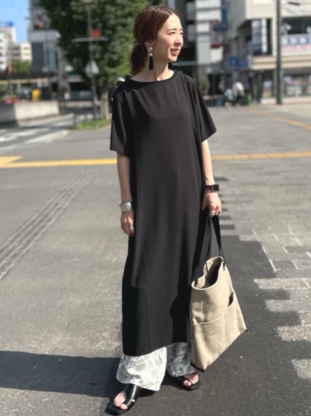 【身長:157cm】 程よいシアー感が黒でも重くなりにくいのがオススメなワンピースに柄ボトムをプラスして大人カジュアルなリラックス感あるコーデにしました。