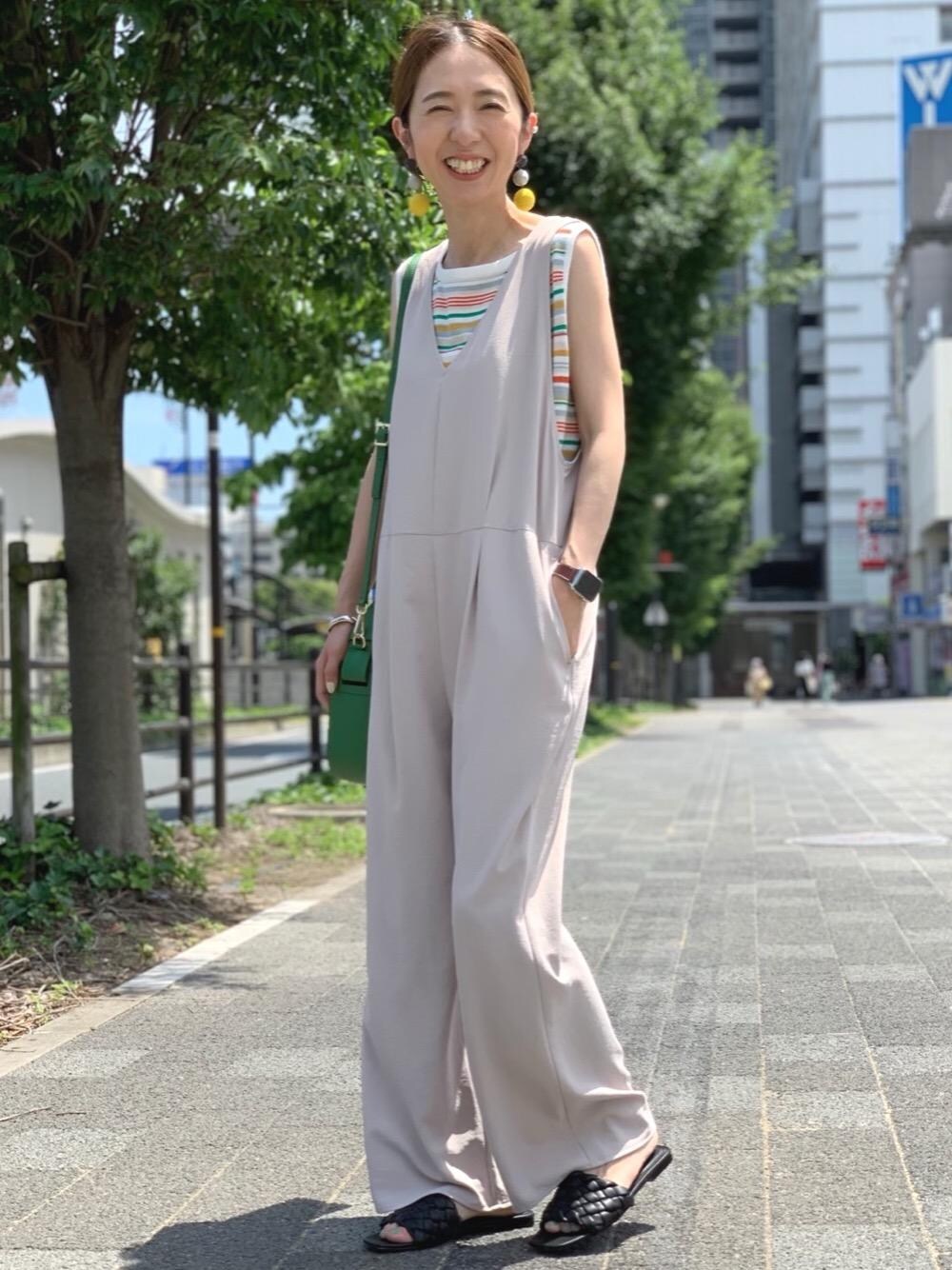 【身長:157cm】 適度におち感のある生地がオススメなナチュラルカラーのオールインワンにノースリーブや小物で色味をプラスしました。