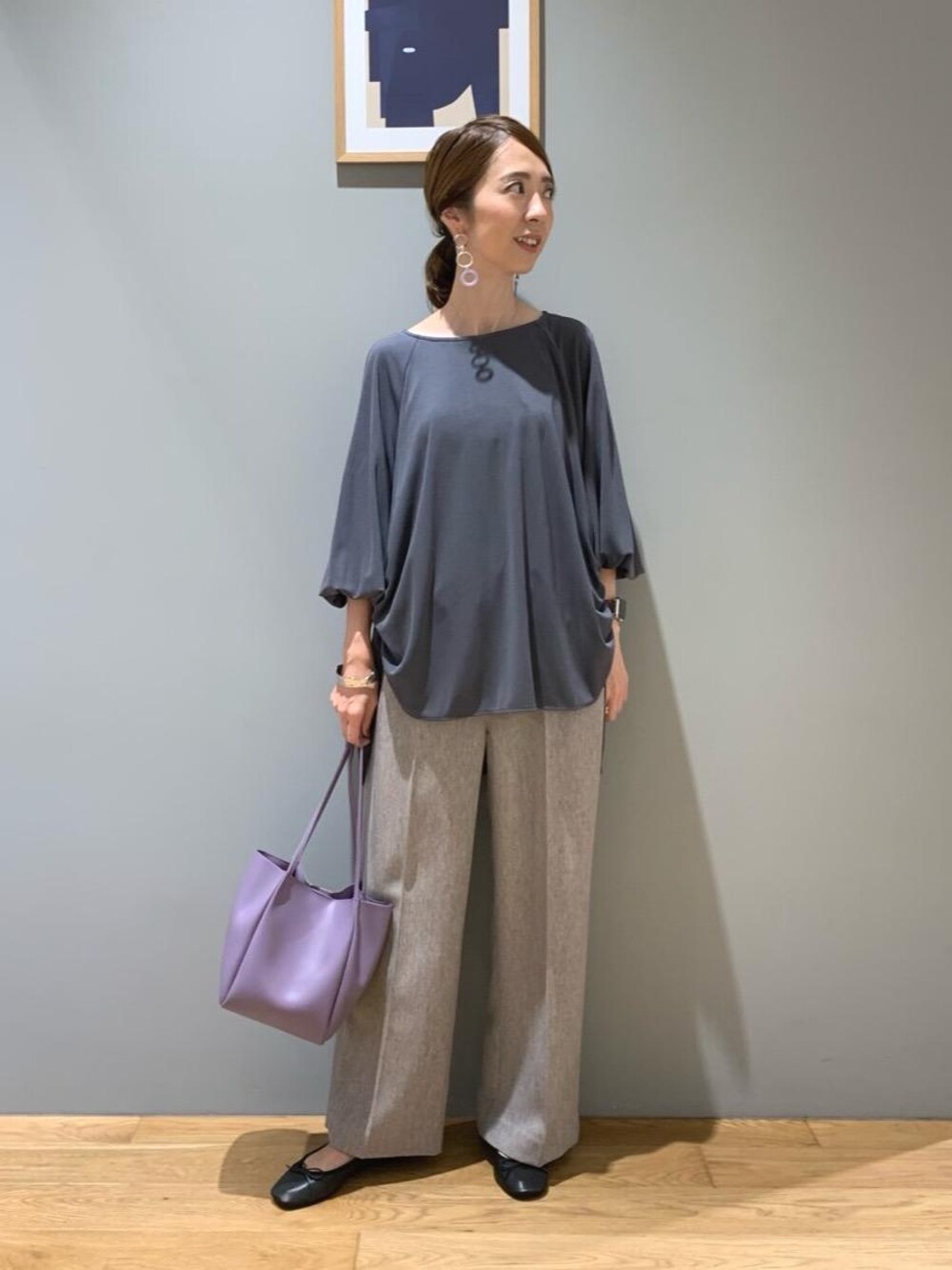 ●身長:157cm ●普段サイズ:トップス 36/ボトムス 36/シューズ 23.0cm・23.5cm 【サイズ感】 トップス ゆったり パンツ 標準的 シューズ 標準的 【コーディネートポイント】 お袖のデザインと裾の絞りがポイントになるブラウスをメインにオンオフ兼用でオススメなコーデにしました。パンツは裾が後ろスリットなのとウエストもゴムのため、シルエットに程よくトレンド感も取り入れつつリラックスして着用していただけます。