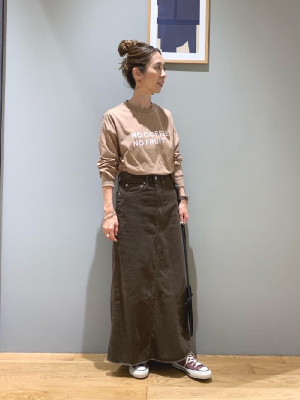 ●身長:157cm ●普段サイズ:トップス 36/ボトムス 36/シューズ 23.0cm・23.5cm 【サイズ感】 トップス メンズサイズで標準的 スカート 標準的 シューズ 標準的 【コーディネートポイント】 メンズのロゴ入りロンTにコーデュロイのスカートを合わせてカジュアルなスタイルにしました。カラーで秋らしい印象にしました。
