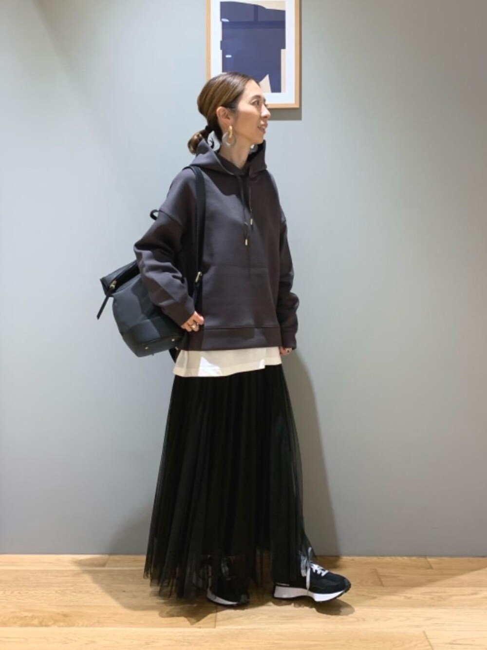 ●身長:157cm ●普段サイズ:トップス 36/ボトムス 36/シューズ 23.0cm・23.5cm 【サイズ感】 パーカー ややゆったり カットソー ややゆったり スカート 標準的 スニーカー 標準的 【コーディネートポイント】 ダンボールフードスリットパーカーは合わせやすいダークグレーのカラーで、チュールフレアスカートのブラックと合わせました。チュールだけど甘すぎないカジュアルなスタイルにしました。