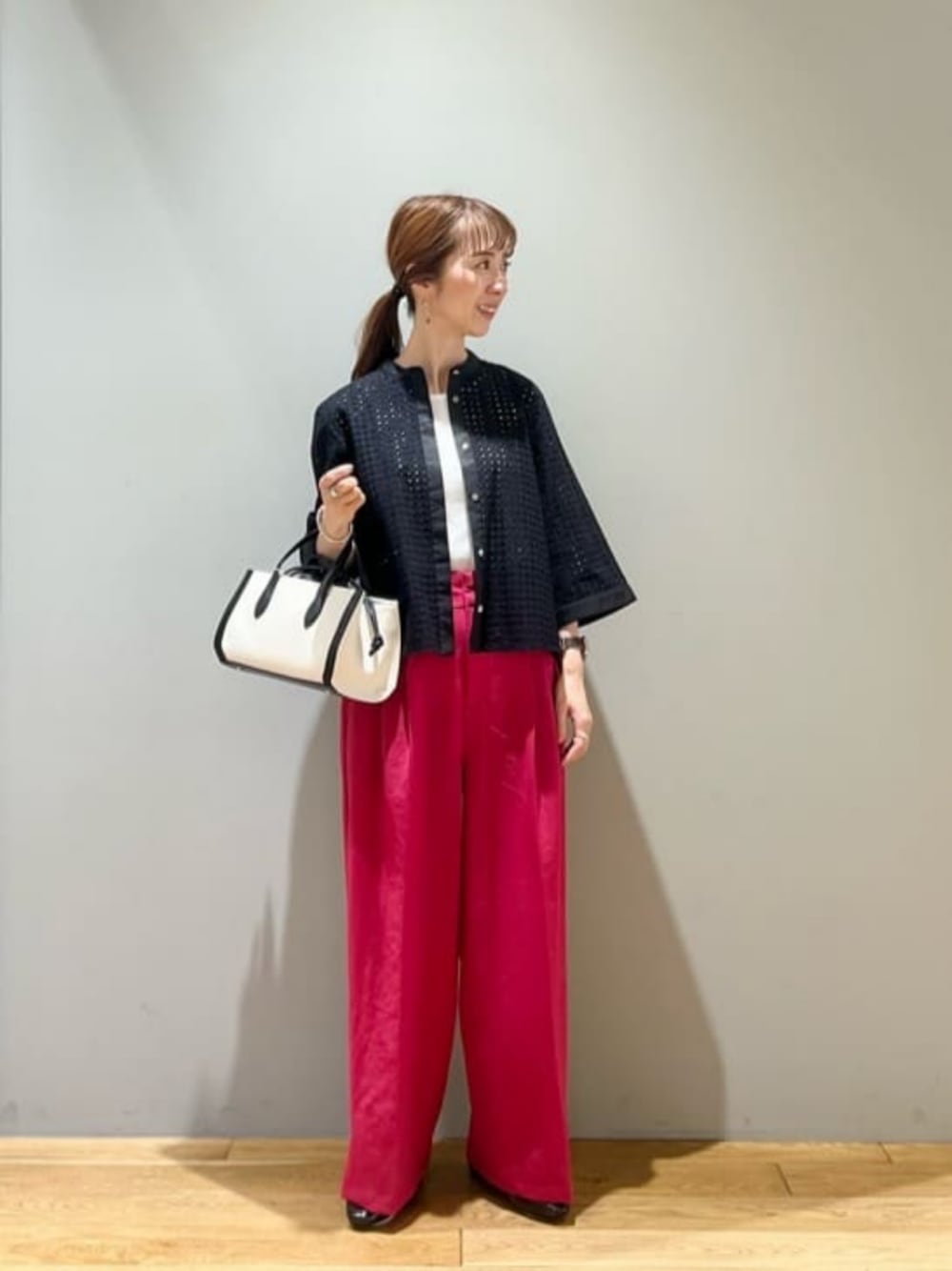 【サイズ感】 ブラウス 着丈やや短め タンクトップ 標準的 パンツ 標準的 シューズ 標準的 【コーディネートポイント】 ブラックのレースブラウスに、ピンクのワイドパンツを合わせた大人カジュアルなスタイルです。足元は晴雨兼用のビットローファーを合わせて、オンオフ兼用でご着用頂けるコーデにしました。