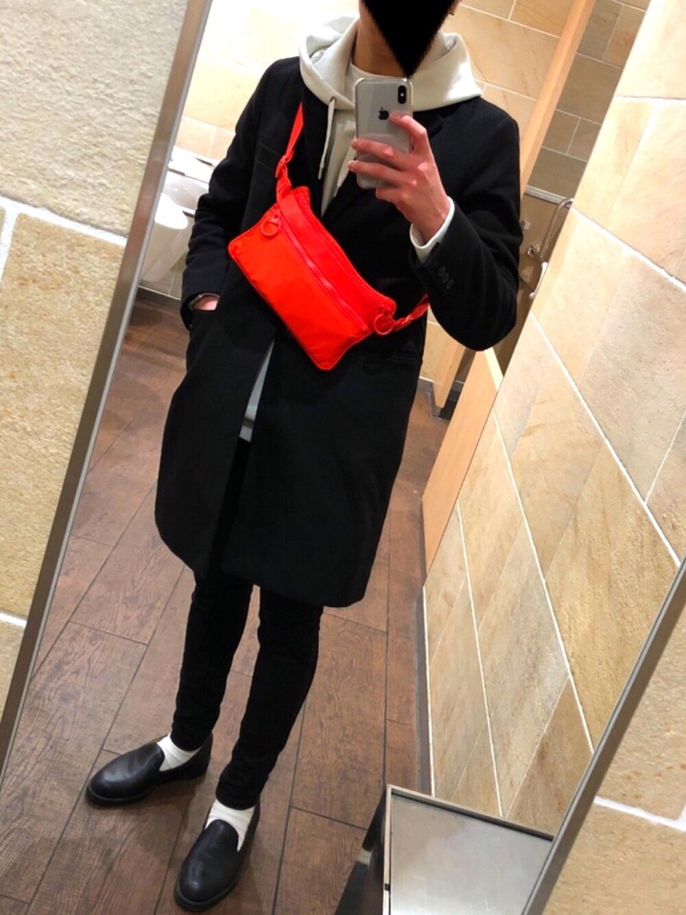 超王道コーディネートにUNIQLO Uのオレンジサコッシュでワンポイント たまたま入ったUNIQLOでUNIQLO Uのパーカーが残ってて勢いで買ってしまった…