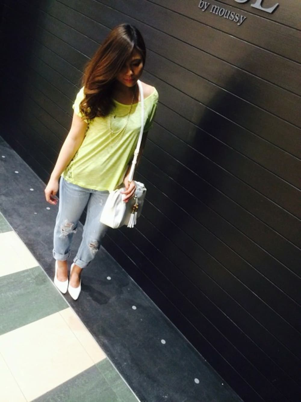 全体的にシンプルでまとめました♡ 小物に、トレンドのホワイトを取り入れたシンプルコーディネートです♡ デニムは、ロールアップで足首チラ見せの美脚効果抜群です♡