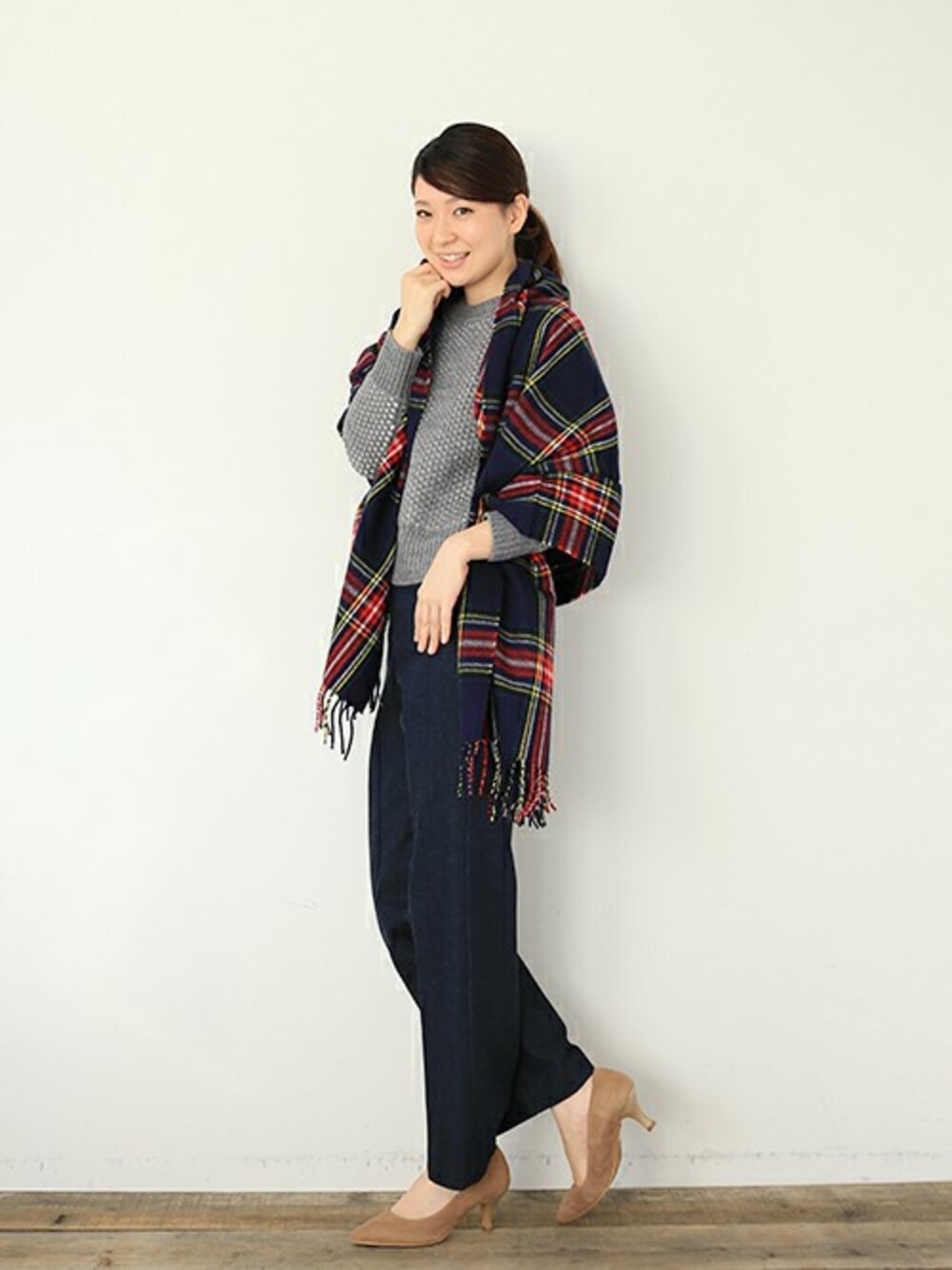 シンプルなニットも、ワイドパンツで合わせて今年らしい着こなしに。肩掛けするだけでパッと華やかになるチェックのストールを差し色に◎