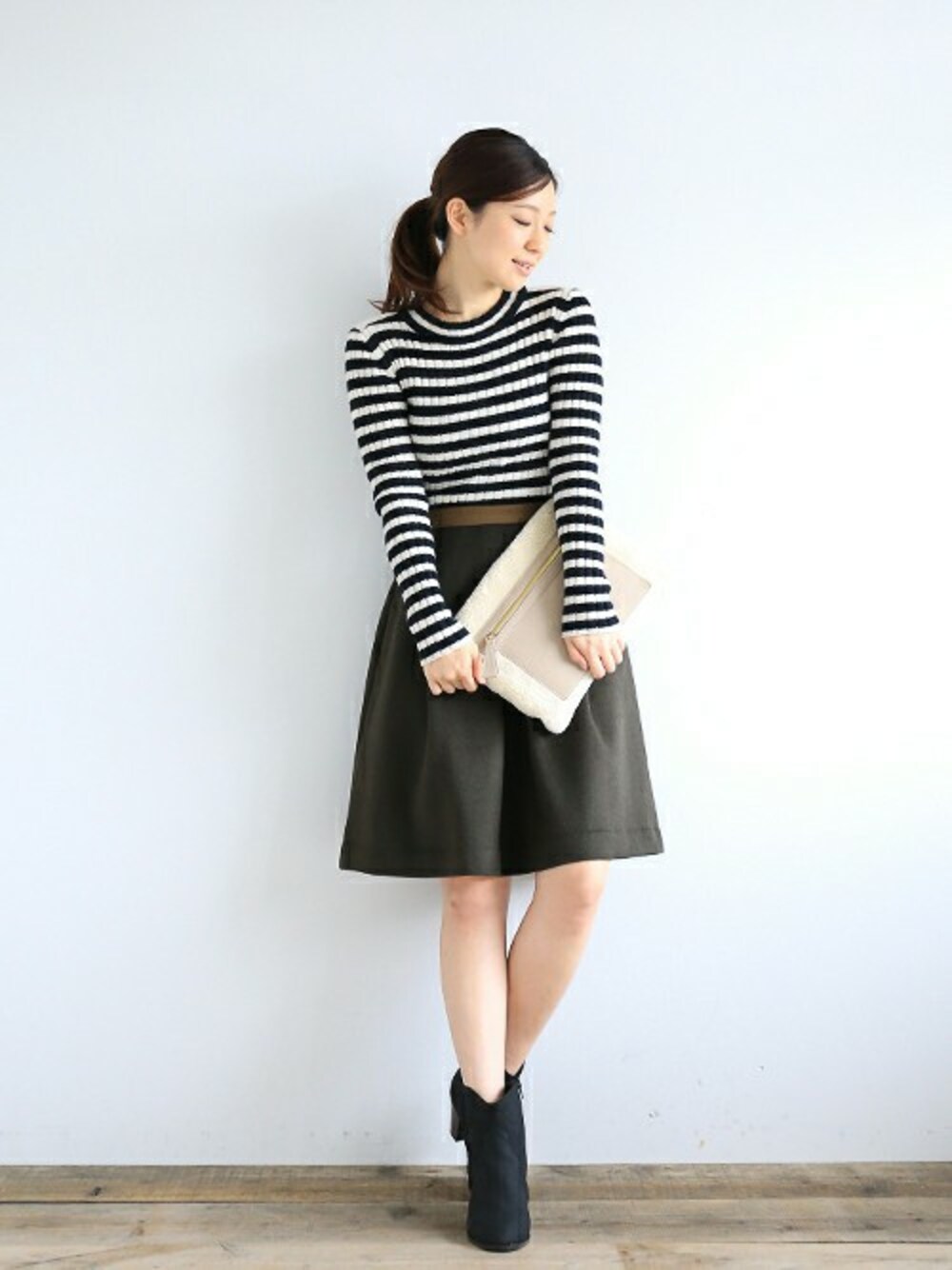 シンプルながら、スカートの“カーキ”を効かせた新鮮な配色♪旬なもこもこボアクラッチバッグをアクセントに、暖かコーデ完成!