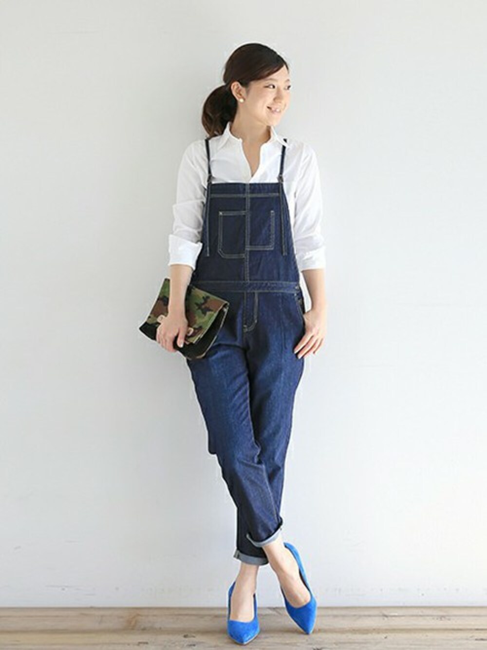 シンプルなシャツ&デニムには小物のカラーを効かせて。