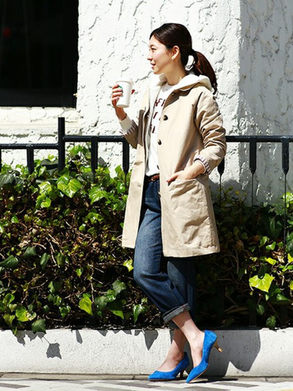 朝晩はまだ薄手のコートが手放せません…。パーカなどとのレイヤードスタイルにも相性の良い、サッと羽織れる軽いステンカラーコートが大活躍!カジュアルな普段のデニムスタイルも、ちょっと上品に仕上がります♪