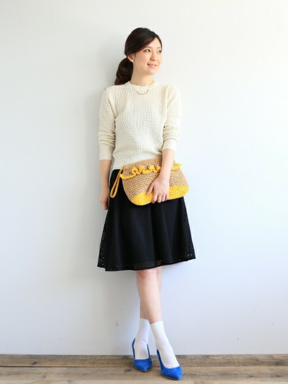 今のシーズン大活躍なコットンニット。旬なヒザ丈スカートと合わせて上品な雰囲気に仕上げました。 ニットとスカートの素材感でメリハリもつけて新鮮な印象に♪春夏らしいバッグや鮮やかなパンプスなど小物の差色もポイントです。