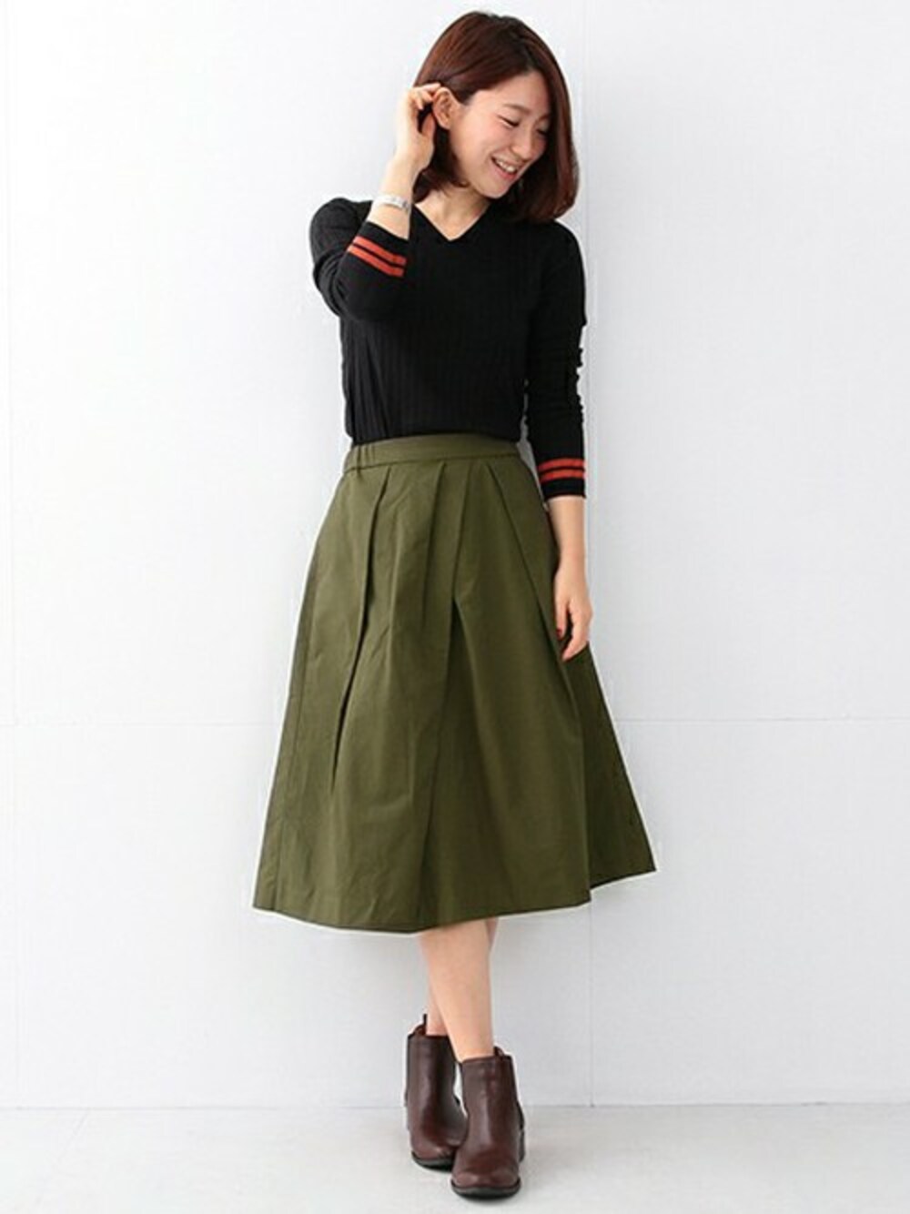 薄すぎず厚すぎず、今の時期にぴったりなニット。 注目のミリタリーカラーのスカートも、上品なミディ丈で取り入れて落ち着いた印象に。