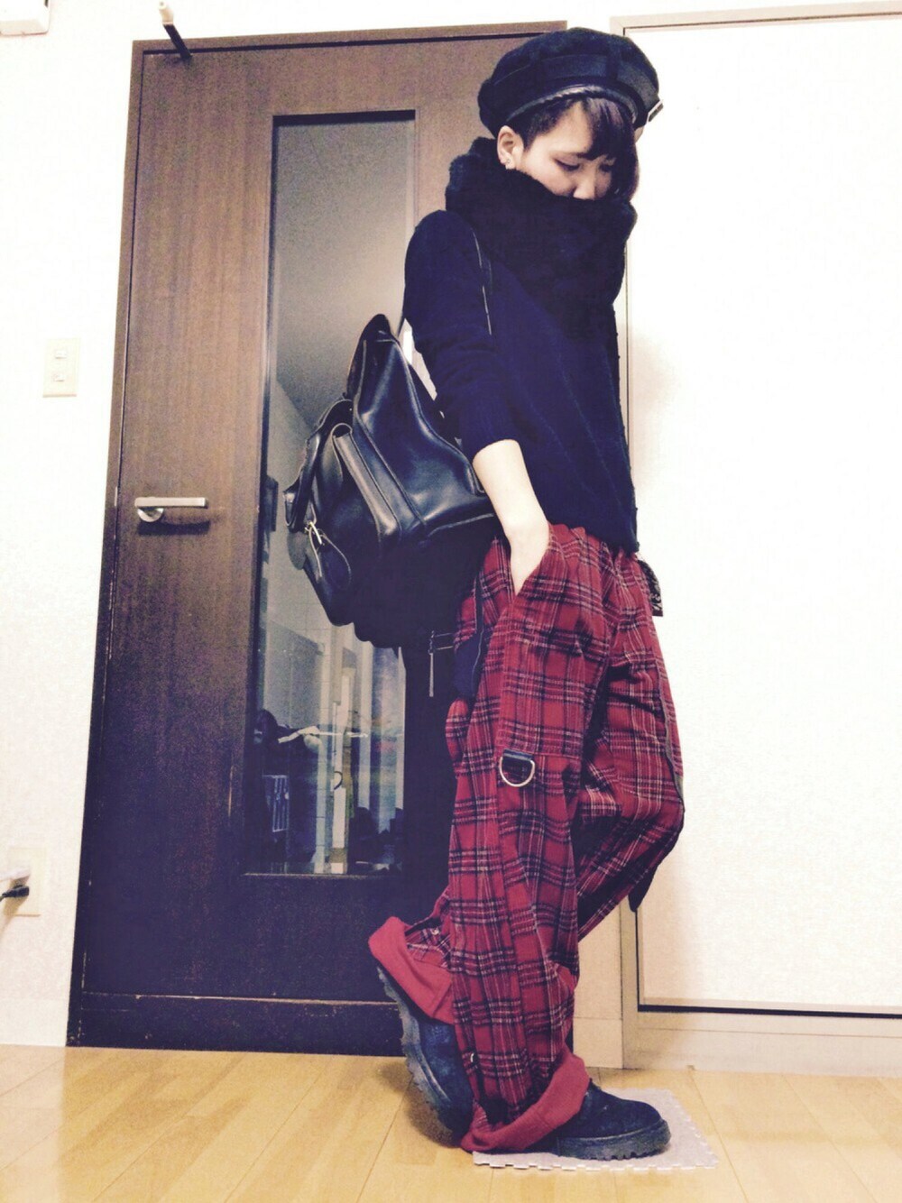 MILKBOYのこのパンツ… 赤でチェックで、 コーデュロイ☺️🔥(なんて私得…!) めちゃくちゃ大きいのですけれど 買わずには入られませんでした。 ガチャベルトでぎゅーってして履きます。 つぶつぶニットはUNIQLO Uのシリーズ。