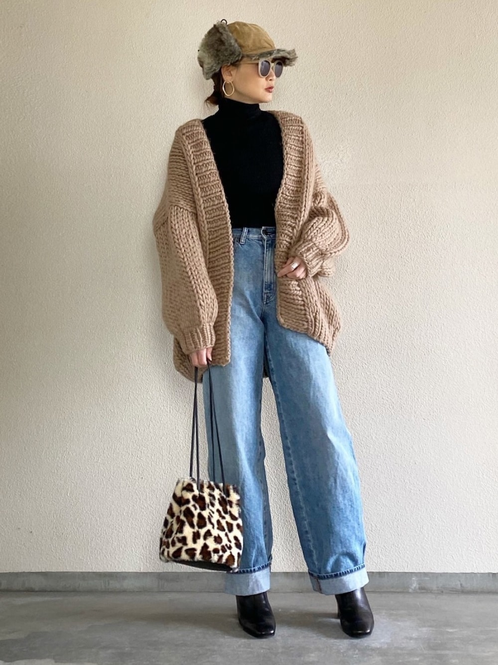 ミトンズのニットカーデは形が綺麗で、細身スキニーにもワイドデニムにもあわせやすいシルエット&丈感。 フライトキャップと巾着バッグのカジュアルあわせ ☑︎Instagram @yukkey_iii