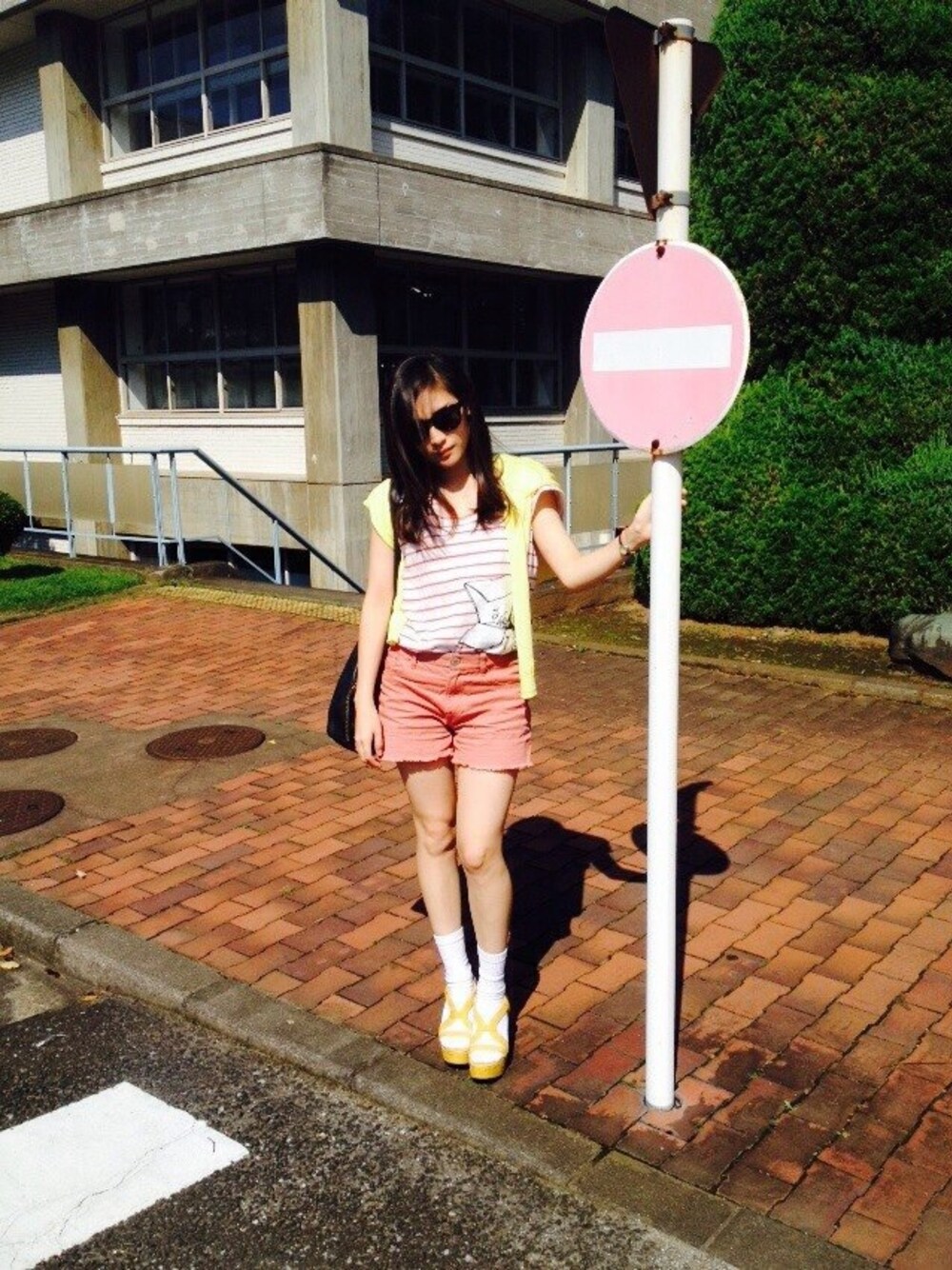 UNIQLOのTシャツの襟を自分でカット✂︎ ミィが隠れてるこのTシャツは わたしが持ってる数少ないボーダーアイテム!