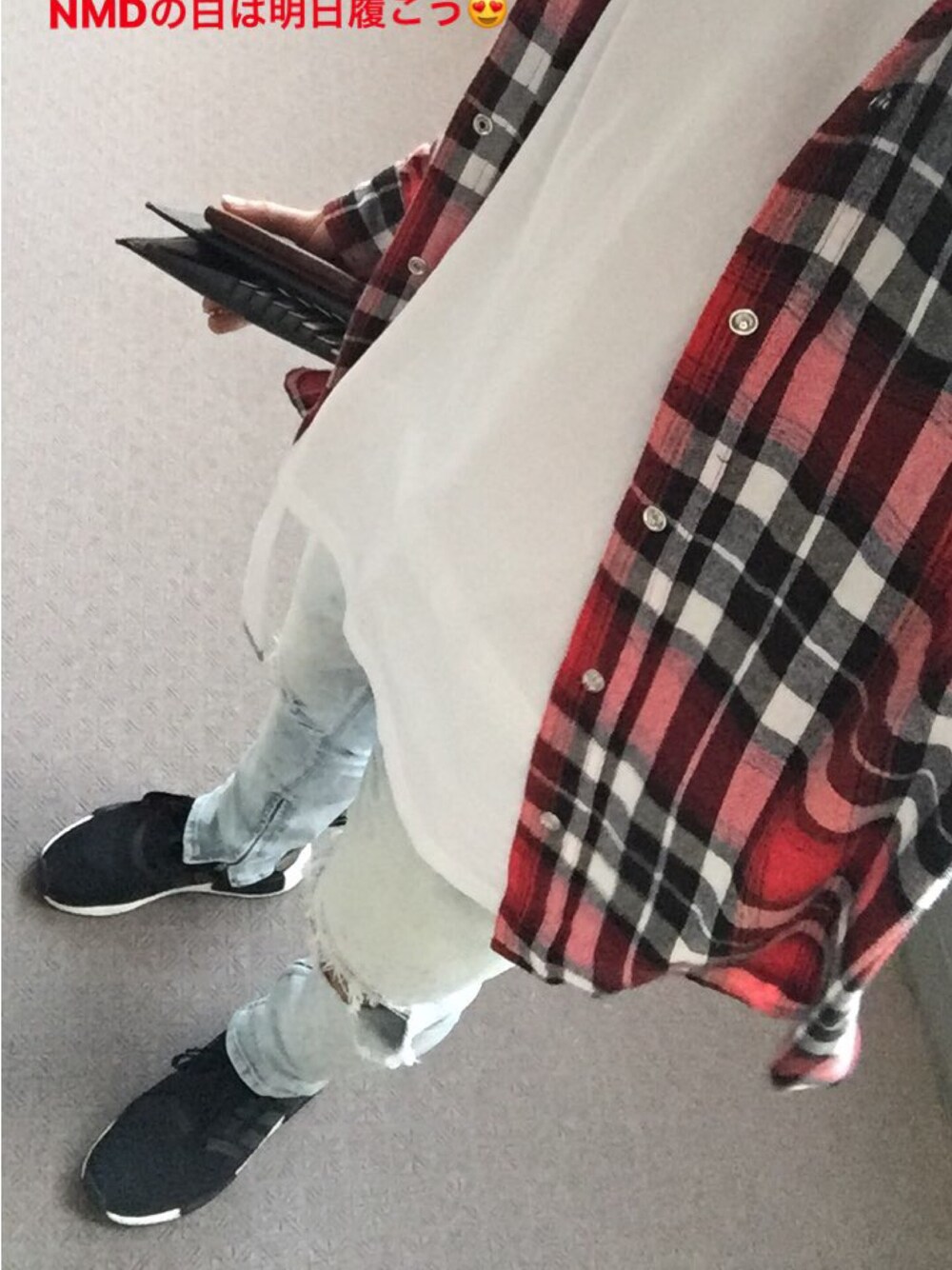 久々の投稿😭 自撮りなので全身うまく映らなくてごめんなさい🙏 昨日のコーデですがオーバーサイズのTシャツに大きめのチェックシャツ、裾ジップにNMDを履くというストリート系で攻めました😏 裾ジップはGOSTAR DE FUGAことGDFのもので日本製のためかなり履きやすくいつも46やLの僕でわざと44(M)のタイトめでも一回履くだけでサイズが馴染んでくれるのでリピしてます😍 NMDは白も持ってますが黒を履きました! かなりの履き心地とカッコよさ、この前出た白は当たりでしたね😏 みんなにカッコイイって言われました笑笑 ストリートからミックス、キレイめまで着るので系統割れが激しいですが見ていただけると幸いです😭 見てくれたりフォローしてくれたりする方には感謝です! 僕もみなさんのコーデを見て学んでます👍👍 どんどん暖かくなるので夏のデニムを使ったコーデも載せていきたいと思ってます😊 では、失礼致します(_ _)