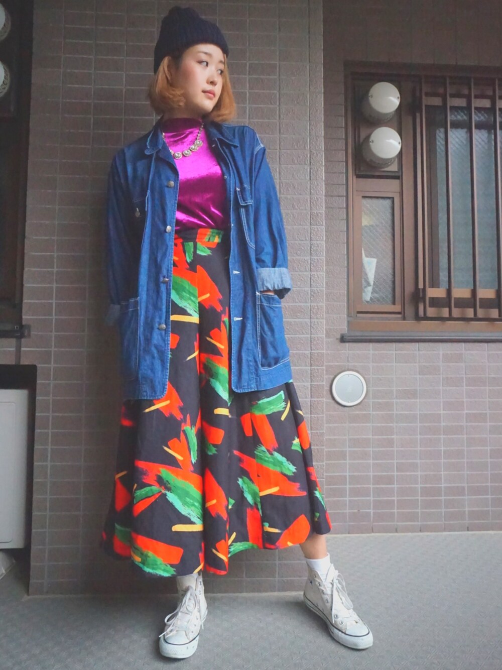 派手色も柄も小物とかアウター、靴をうまく組み合わせたら自然と溶け合うコーデ☺️❤️ Instagram @yukipi.pi.pi