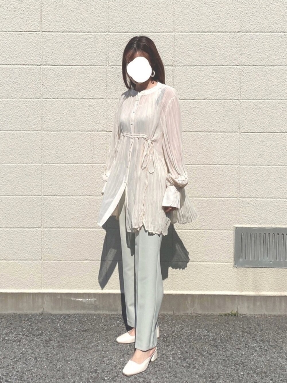 今季流行のミントカラーを取り入れました!ブラウスはシャーリングになっていて、サイドで絞れるのがポイントです🌼