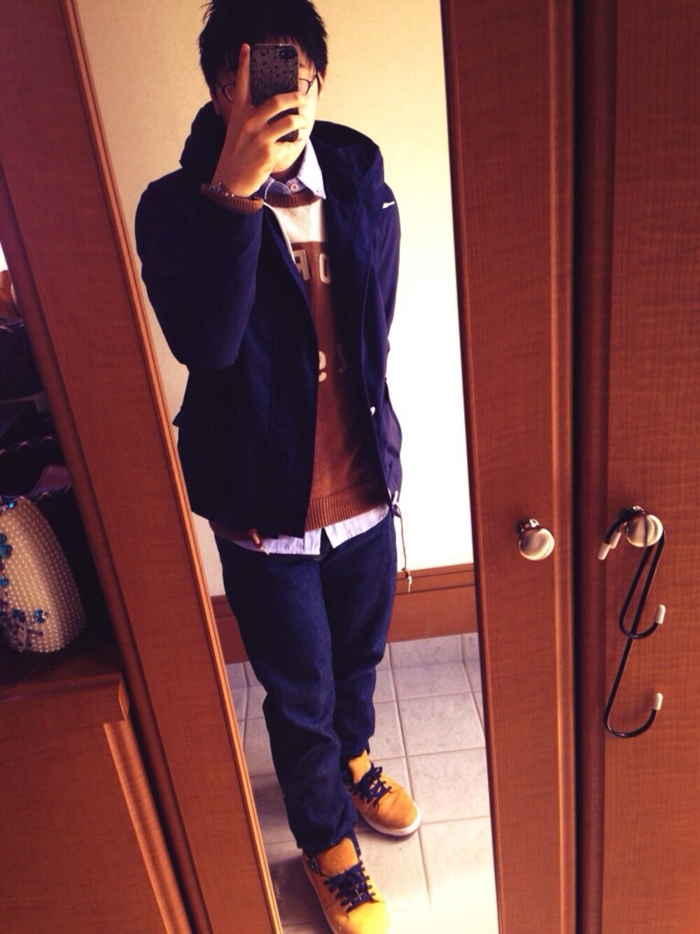 ちょっとゆるーく優等生にしてみた〜! スニーカーとパンツのデニムを合わせてるand デニムで無骨さUPがポイント!!わら