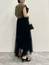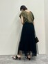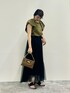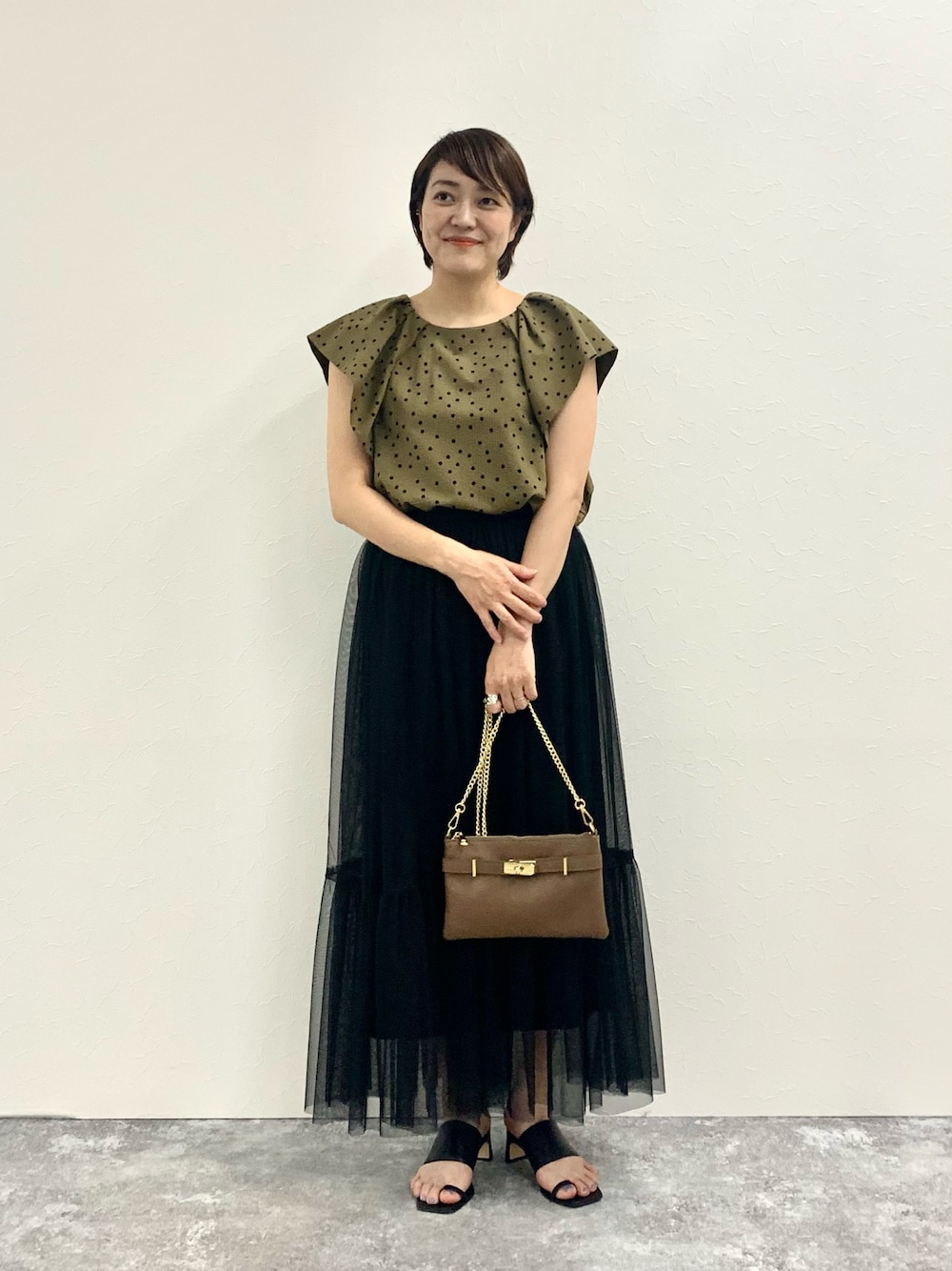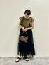ドット柄が映えるブラウスは 立体感ある素材で涼しげな着心地 チュールロングスカートに ブラウスをインすることで 脚長効果もあり◎ 落ち着いたカーキ×ブラックの組み合わせで 秋まで長く着られます