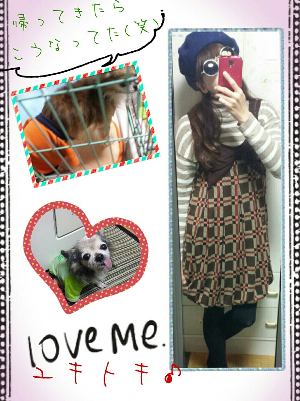 こんばんは~ 前回の服装にたくさんの「いいね」をありがとうございます♪(/ω\*) 仕事終わりに少しずつお礼メッセージ送らせてもらいます♪ヽ(´▽`)/ 今回は、ブラウン✖ベージュです♪ヽ(´▽`)/(笑) 先日の休日コーデ♪ 今日、めっちゃ寒かったから愛犬たちに服着せて出かけました(*´∀`)♪ 帰宅して愛犬くん見たら、服が腰辺りまで脱げてますやん(゜ロ゜;ノ)ノ笑っ 可愛いから、とりあえず撮影(*´∀`)♪ 癒しですね~( 〃▽〃)