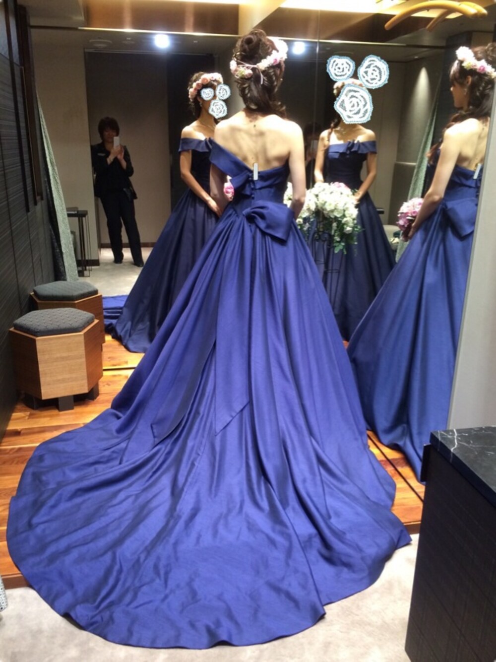 本番で着たドレス。 でも花冠はなんか合わない気がしてやめました。実物はもっと濃い色です。くらーい紺色。 花冠はずっとやりたかった事だったのでドレスを変えて花冠するか、花冠をやめるか相当悩んだなぁ… ドレス 帝国ホテル タカシマヤ メゾン ド コスチューム