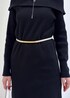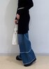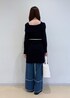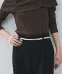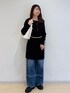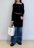 膝上丈のワンピースをデニムパンツと合わせたレイヤードコーデです。 のっぺりとしないようにベルトをプラスするのがオススメ!