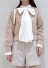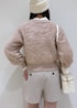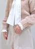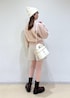 キラキラのピンクニットにリボンがポイントのシャツを合わせた少し甘めなコーディネートです。 インナーのシャツは袖のフリルも可愛いのでニットからチラ見えさせるのがオススメです♪