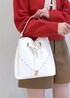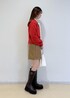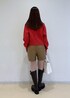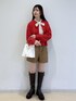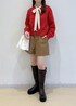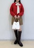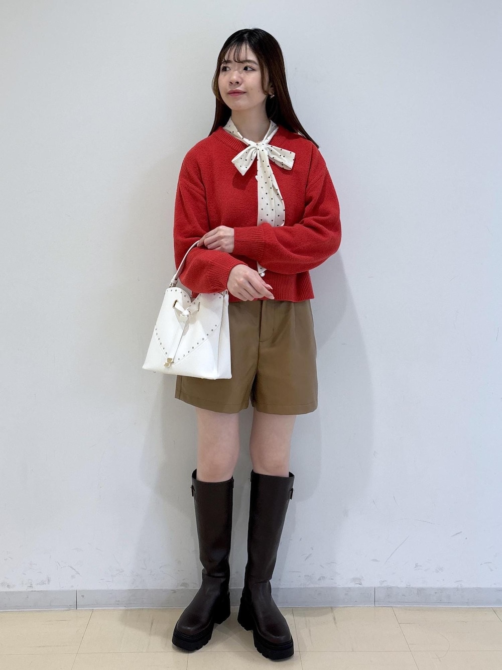 冬に着たい赤色が目を惹くコーディネートです。 インナーにドット柄のリボントップスを合わせてポイントにしました。 ミニ丈パンツはレザーライクの合皮素材で甘くなりすぎず大人フェミニンコーデに仕上がります。