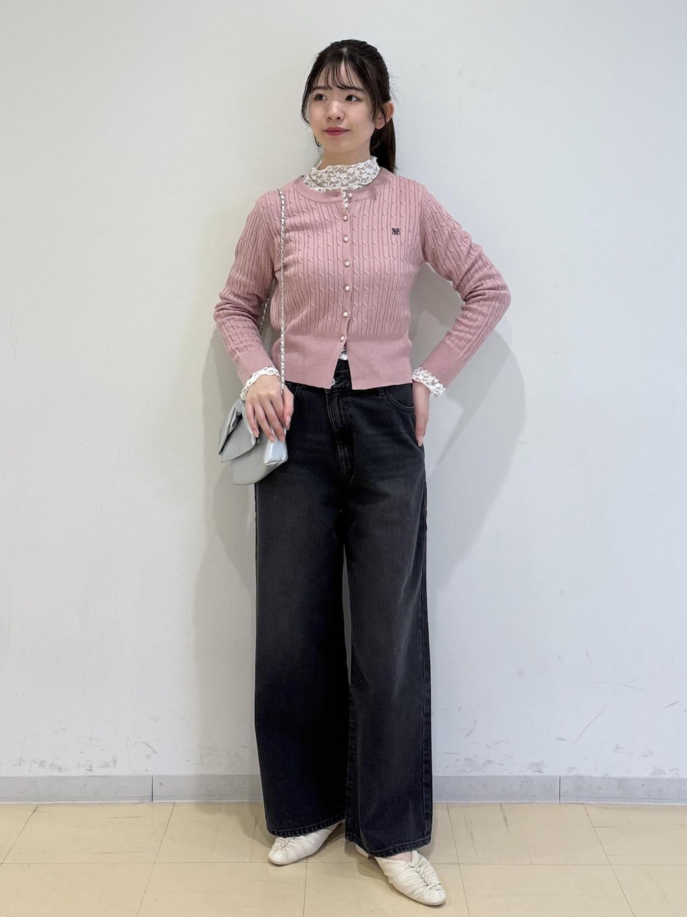 ピンクのカーディガンが主役のコーディネートです。 甘すぎないくすみピンクが大人カラー!チャコールのデニムでカジュアルにしました。 レースのインナーを合わせることでシンプルになりすぎずポイントにもなります♪ ※掲載のないものはスタッフの私物です