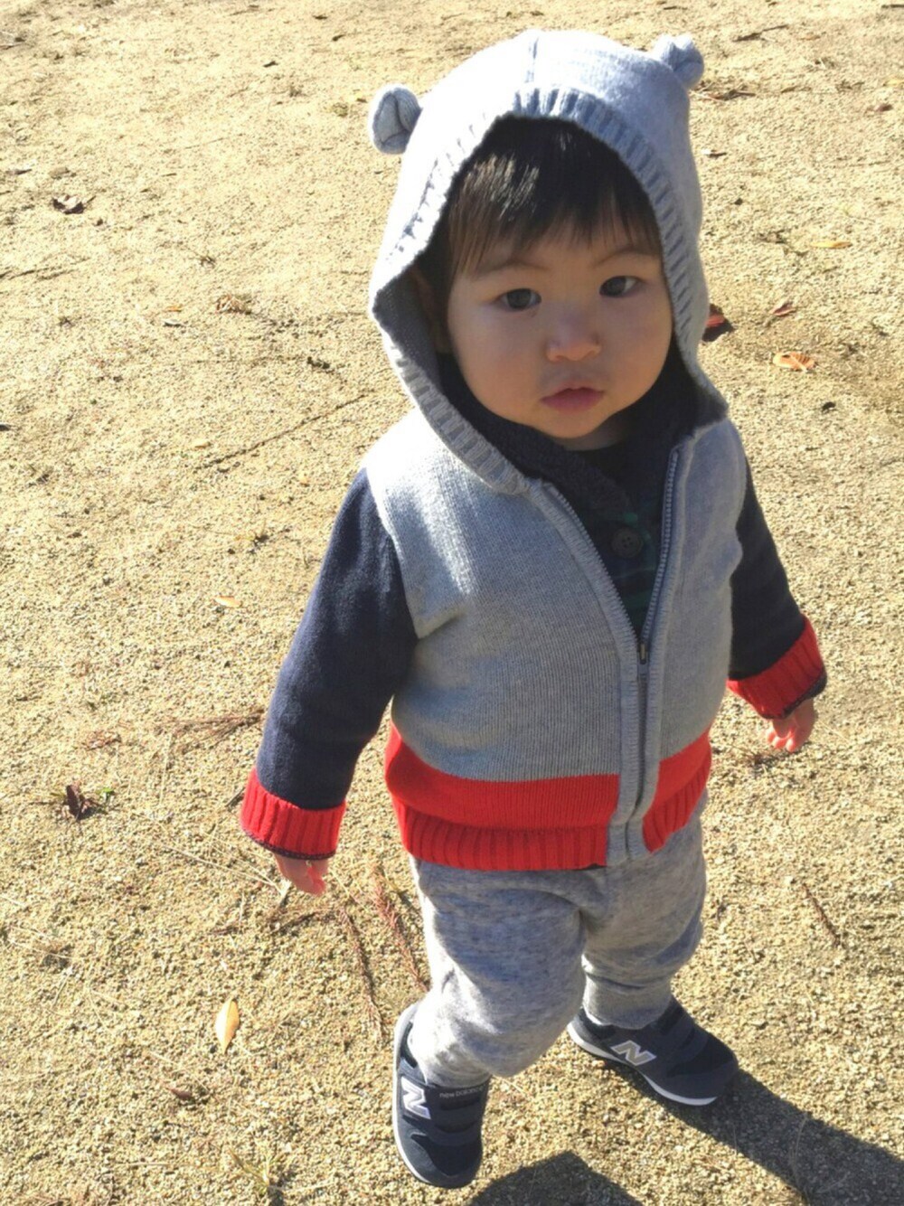 ハイハイ期によく着せてたニットパーカー、久々の登場♬ 中にベスト重ね着してます。