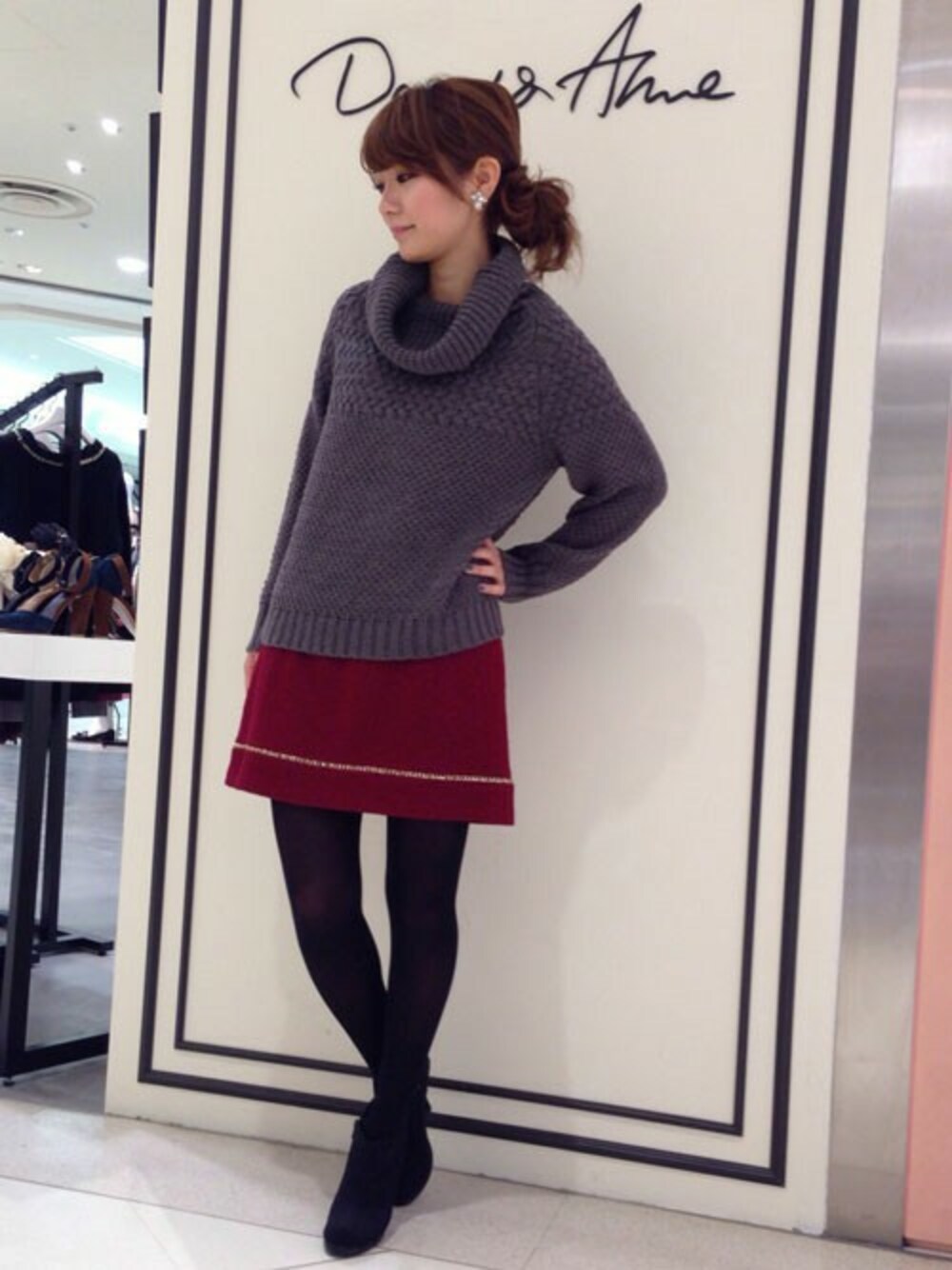 ゆったりめのオフタートルニットに、裾のチェーンがポイントのウールスカートを合わせました。 ベーシックなGRAYに、WINEのカラーを差し色にしたコーディネートです♡