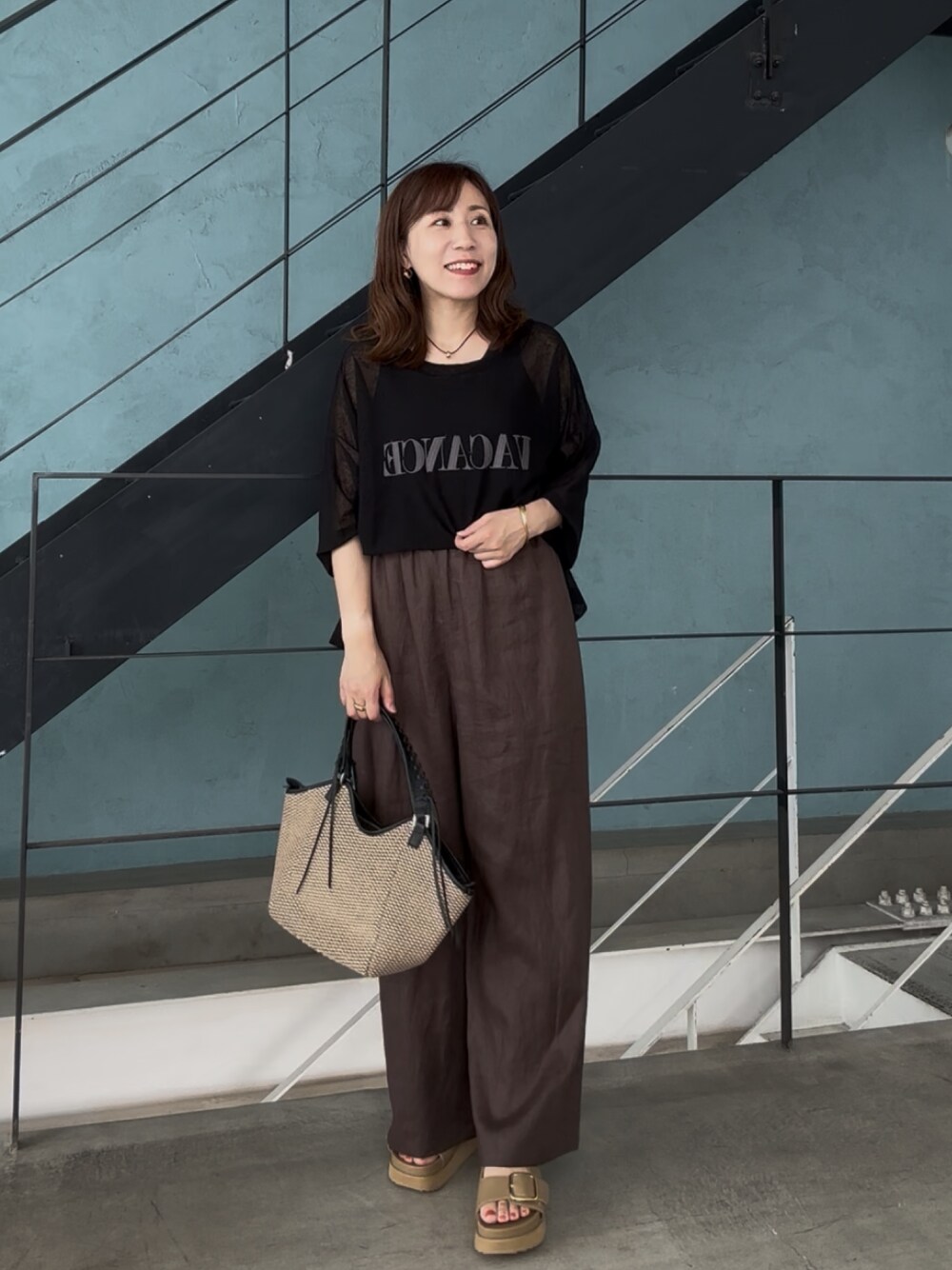 ロゴがアクセントになったシアートップス! サラッとした肌触りで夏でも快適に着れそうです。 合わせたのはリネン素材のパンツ。 ゆるっとしたシルエットで、ストレスなく着用できます♪ 全体的に落ち着いた色合いで、大人カジュアルにまとめました。 ※パンツは38を着用。 ヒールを履いてちょうど良い丈感です。