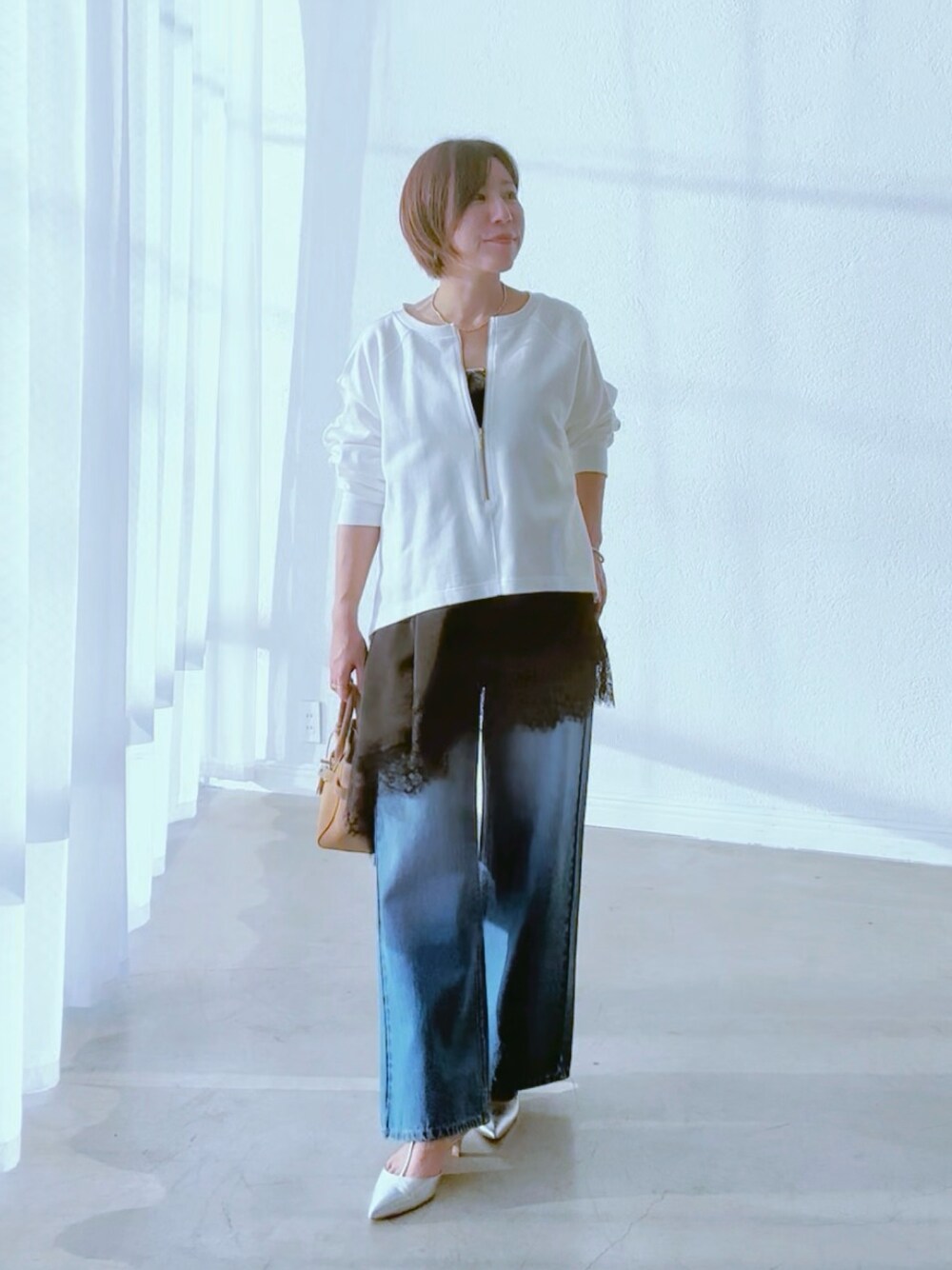 トレンドのレースキャミをレイヤードしたコーデ。 斜めになったヘムラインとレースのあしらいがトレンド感たっぷりのキャミソール。 カジュアルな印象のあるスウェットもレースをレイヤードするだけで女性らしい着こなしに。 デニムを合わせて爽やかな春コーデにしました。